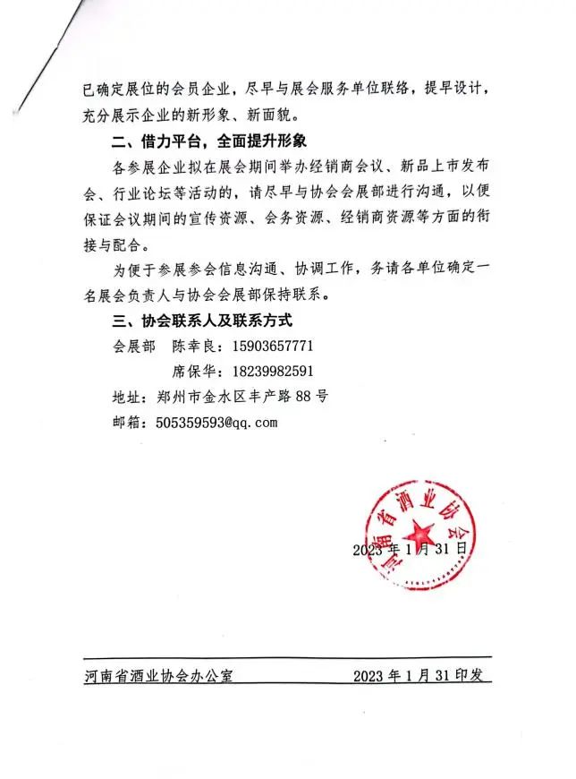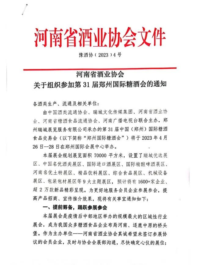 由中国酒类流通协会、瑞城文化传媒集团、河南省酒业协会、河南省糖酒食品流通协会、河南广播电视台联合主办,郑州瑞城展览服务有限公司承办的第31届中国(郑州)国际糖酒食品交易会(以下简称“郑州国际糖酒会”)将于2023年4月26日--28日在郑州国际会展中心举办。本届展会规划展览面积70000平方米,设置了瑞城优选展区、中国名优酒类展区、国际进口酒展区、国际精酿啤酒展区、河南名优土特展区、精品饮料展区、综合食品展区、机械设备展区、包装包材展区等9大主题展区, 预计将有1600+家企业、超2万款新品精彩呈现。为更好地服务会员企业参展参会,提高产品招商、宣传推介效果,现将有关事宜通知如下:本届展会是疫情后中部地区举办的规模最大的区域性行业展会,成为我国众多糖酒食品企业布局河南、逐鹿中原的桥头堡。作为主办单位——河南省酒业协会真诚希望未签订参展协议的会员企业,及时与协会会展部沟通,尽快确定心仪的展位;已确定展位的会员企业,尽早与展会服务单位联络,提早设计,充分展示企业的新形象、新面貌。各参展企业拟在展会期间举办经销商会议、新品上市发布会、行业论坛等活动的,请尽早与协会会展部进行沟通,以便保证会议期间的宣传资源、会务资源、经销商资源等方面的衔接与配合。为便于参展参会信息沟通、协调工作,务请各单位确定一名展会负责人与协会会展部保持联系。