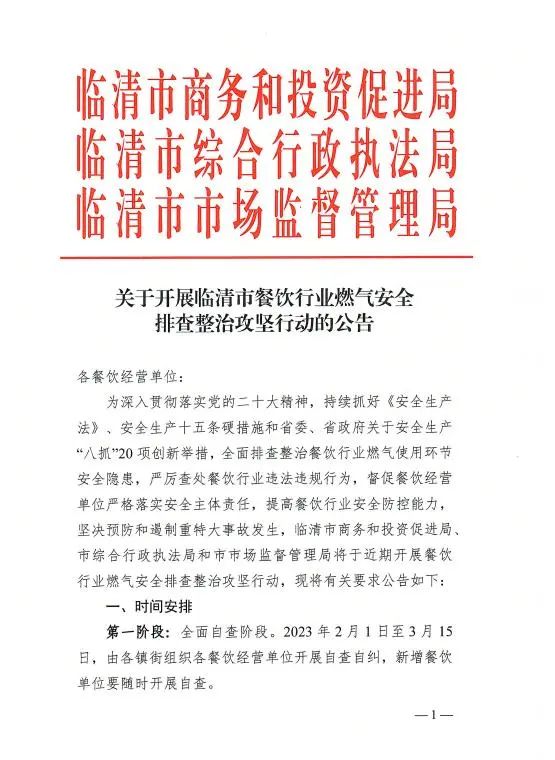 关于开展临清市餐饮行业燃气安全排查整治攻坚行动的公告