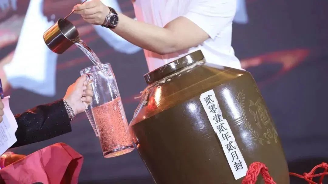 在开酒坛的仪式中更有讲究,首先由酒令官宣读黄历,彰显中国传统文化,然后九为集团执行总裁运明博先生用铜盆净手,以示对宾客的敬重,进而揭开红布用锤子敲击坛口早已干涸的黄泥,揭下里面的密封膜,一坛美酒出现在大家的眼前,在酒令官“一生二,二生三,三生万物”的号子中为大家祈福,舀出三舀佳酿,盛于分酒器中,透过玻璃可看到美酒酒花均匀并泛着微黄,足见酿酒之初选料的良苦用心。
