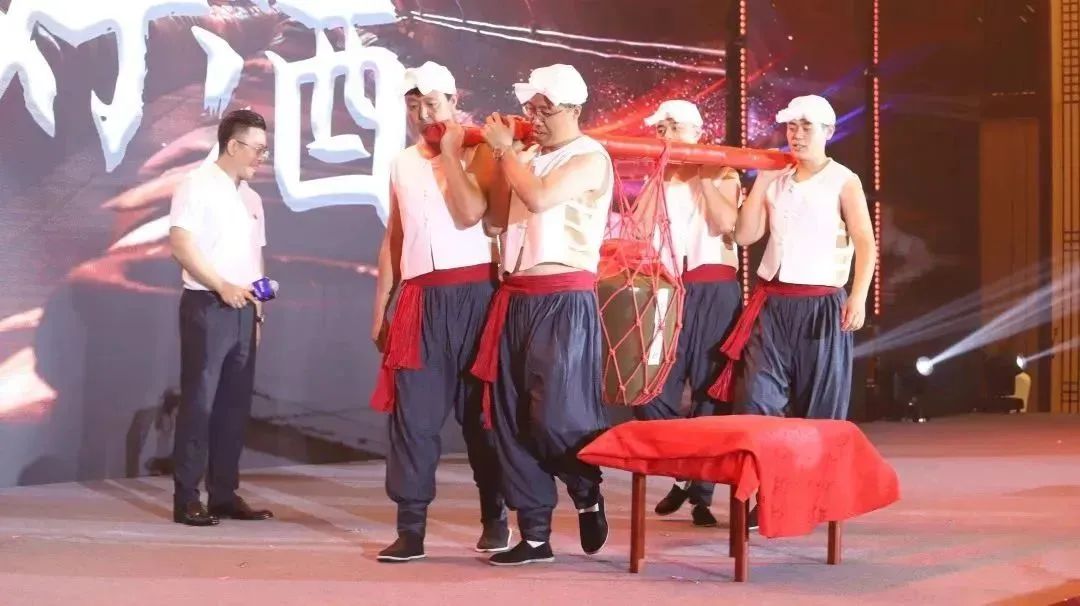 酒是一种“礼”,既然是“礼”,就须用仪式来呈现,在九为的庆典上就把这种“礼”发挥的淋漓尽致。只见四名身着西北汉子服饰的员工,伴随着豪迈的背景音乐,在锣声敲响的一刻,于酒令官“起、行、转、落”的号令下,逐一完成动作,在一套严苛而考究的礼仪程式中,将一坛重达100斤的美酒呈上舞台。