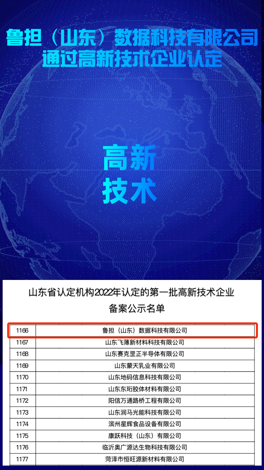 近日,全国高新技术企业认定管理工作领导小组办公室发布了《关于对山东省认定机构2022年认定的第一批高新技术企业进行备案的公告》,山东农担权属公司鲁担(山东)数据科技有限公司正式获得国家高新技术企业认定。
