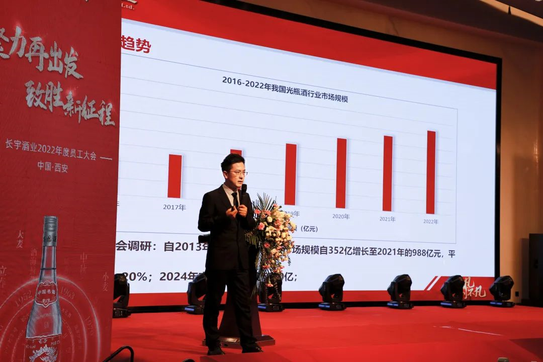 会上,长宇酒业市场部经理卢小龙对《长宇酒业2023年度市场部工作报告》做出了讲解,分别从光瓶酒行业现状分析、2022年市场数据、企业战略方向概述、2023年重点工作、公司相关管理制度等方面对新一年市场现状、企业重点经营方向及发展趋势作出详细分享。