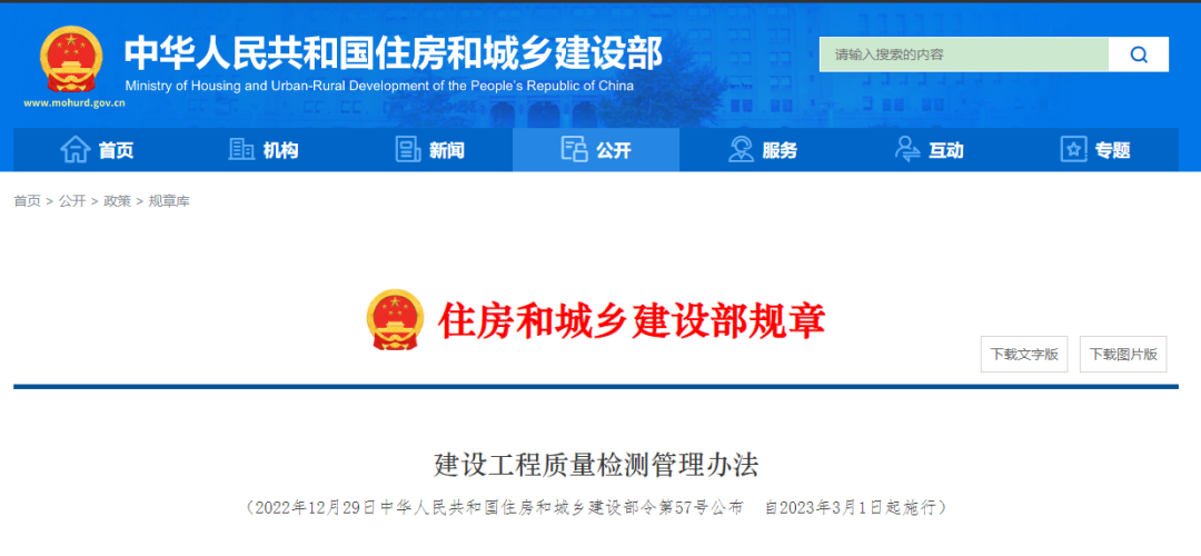 近日,《建设工程质量检测管理办法》中华人民共和国住房和城乡建设部令第57号发布,自2023年3月1日起施行。