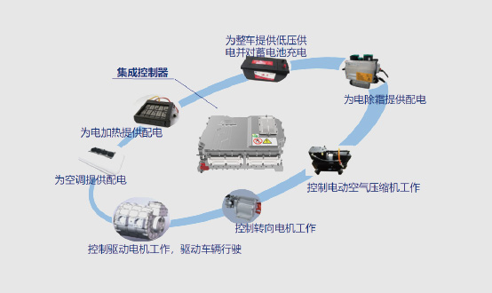 集成驱动电机、转向电机、空压机、低压及高压配电五大模块控制器于一体,高压连接点更少,故障率更低,使用更可靠。