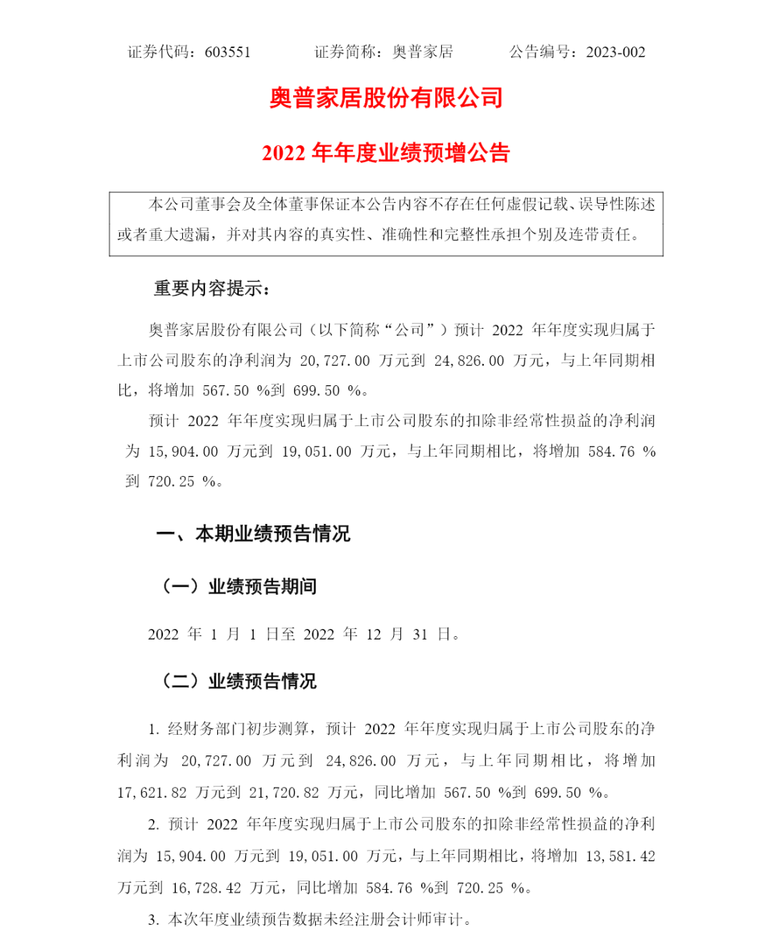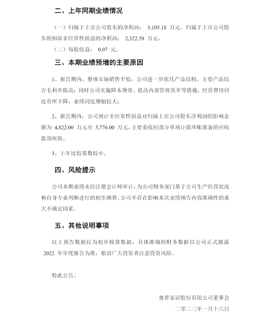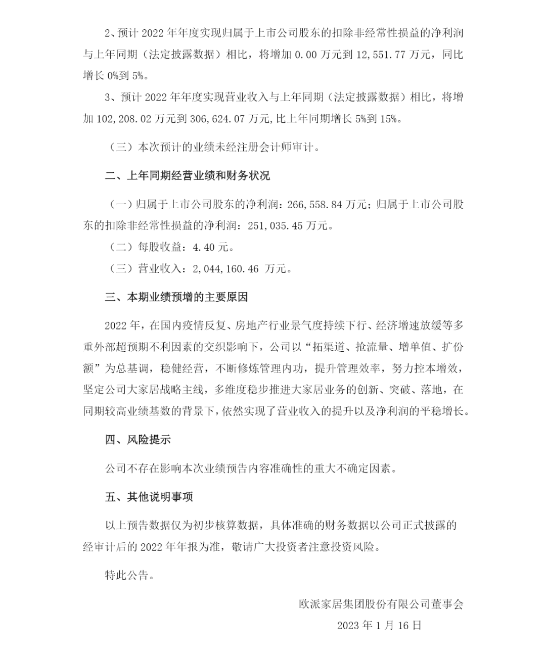 1月16日,欧派家居发布2022年年度业绩预增公告。