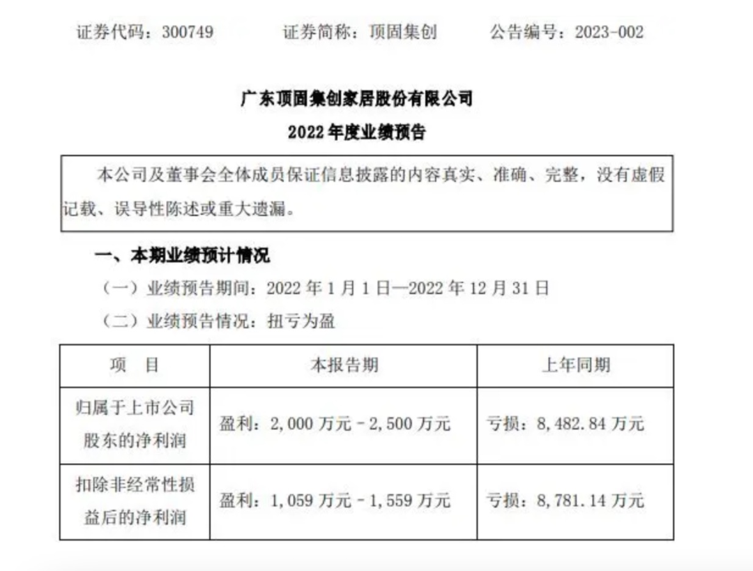 1月19日,顶固集创发布业绩预告称,预计2022年归属于上市公司股东的净利润2000万元-2500万元,上年同期亏损8482.84万元,同比扭亏为盈。公告显示,报告期内公司营业收入预计较上年同比下降约15%-20%。