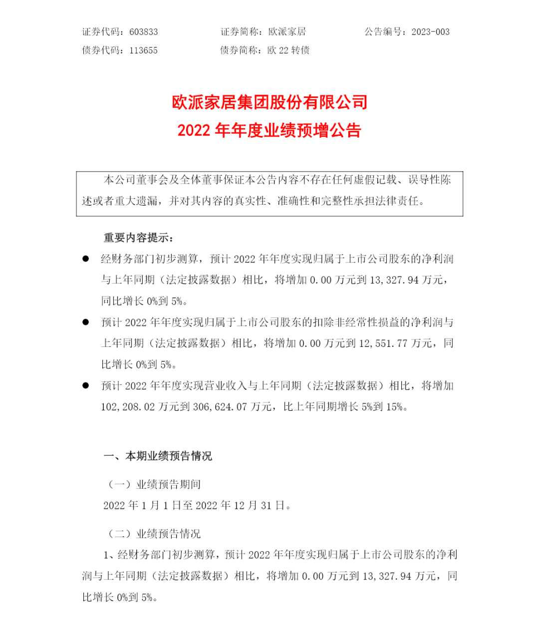 公告显示,经财务部门初步测算,预计欧派家居2022年年度实现归属于上市公司股东的净利润与上年同期(法定披露数据)相比,将增加0.00万元到13,327.94万元,同比增长0%到5%。