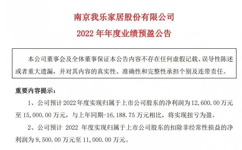 1月29日下午,我乐家居发布2022 年年度业绩预盈公告:2022年度实现归属于上市公司股东的净利润为1.26亿元至1.5亿元,与上年同期-1.62亿元相比,将实现扭亏为盈。