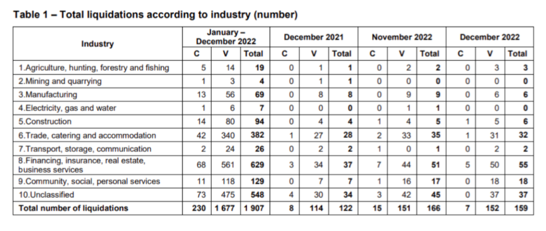 大多数被清算的公司都是自愿进行的,只有七家被强制倒闭。南非2022全年有1,907家企业和公司被清算,低于2021年的1,932家。