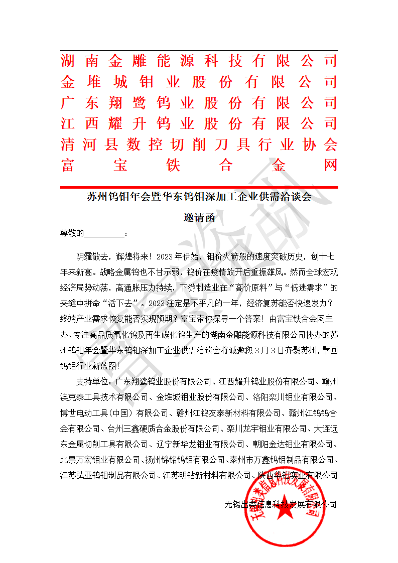苏州钨钼年会暨华东钨钼深加工企业供需洽谈会