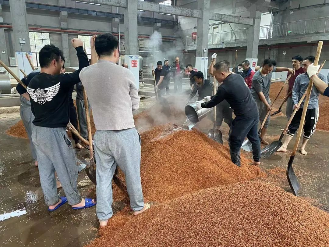 润粮,体力不是最大考验,对工艺的掌握和细节的把控更甚。要精准把握投水量和温度等工艺标准,也要做好人员配合、翻粮方法等细节,让每一粒高粱都吸水均匀。