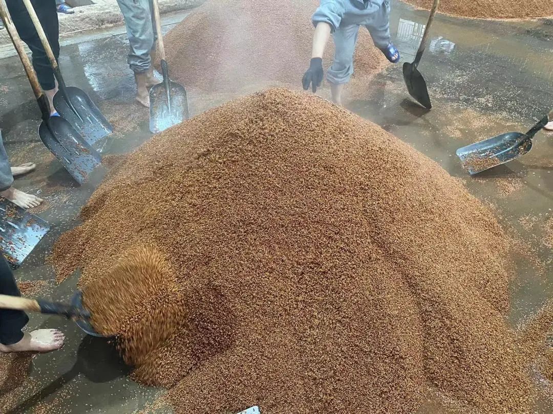 这一轮不产基酒,工序包括高粱破碎、润粮、蒸粮、摊晾拌曲、堆积发酵、入窖发酵,其中润粮尤为关键。