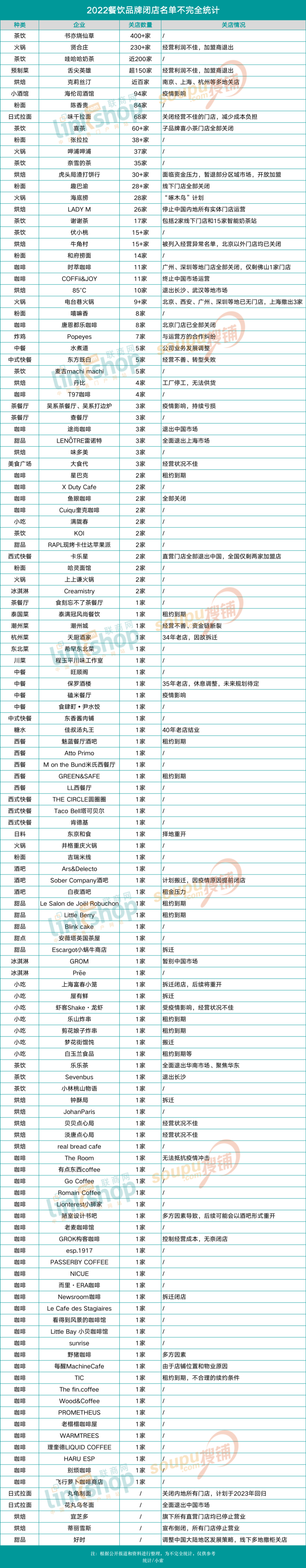 光是在封控和堂食之间的反复横跳,就扼住了许多餐饮企业命运的喉咙。街边倒闭的夫妻店,极限承压的连锁品牌,担忧的顾客,疯狂的外卖......一笔一笔地勾画出了这个闭环里的众生相。企查查数据显示,截止12月31日,2022年共有51.9万家餐饮相关企业注销吊销。其中,1-4月为餐饮相关企业注销吊销的高峰期,约60%相关企业在此期间停止经营。3月注销吊销10.6万家,是全年注销吊销数量最大的月份,其次是4月,注销吊销7.0万家。实际上,疫情三年时间,全国就有超170万家餐饮相关企业注销吊销,超过了过去十年注销吊销数据的总和。闭店潮一波接着一波,不少餐饮人在接连的打击下失去了信心。去年年初,疫情多点爆发,餐饮行业陷入水深火热之际,甚至传出了重庆一知名餐饮老板不堪重负,留下遗书跳江失联的消息。疫情,早已成为无法忽视的大背景。即使是大企业,也不得不承认,没有谁能够在这场疫情的寒冬中独善其身。据《联商网》不完全统计,2022年,全国至少有134家餐饮品牌,超1873家餐饮门店关闭(文后附总表)。品类涉及咖啡、烘焙、快餐、小吃以及粉面等,其中既包括星巴克、肯德基、书亦烧仙草、贤合庄、克莉丝汀、味千拉面等多家知名连锁品牌,也不乏如牛角村、Popeyes、GROM冰淇淋等红极一时的网红品牌,甚至是M on the Bund米氏西餐厅、保罗酒楼、佳叔汤丸王等经营十数年的经典老店。随着国内咖啡市场的不断扩张,2022年的咖啡赛道依旧十分热闹,扩张、跨界、融资等动态不断。在疫情背景下,咖啡市场竞争进一步加剧。据《联商网》不完全统计,2022年,至少有38个咖啡品牌,超74家门店关闭。其中,连锁咖啡品牌的关店数量远超过独立咖啡店,达45家,占咖啡闭店数量的61%。