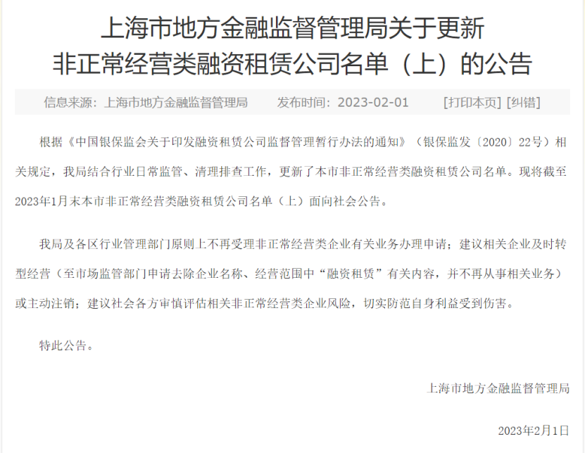 2023年2月1日,上海市地方金融监督管理局发布了上海市非正常经营类融资租赁公司第一批名单(截至2023年1月),共涉及259家融资租赁公司。