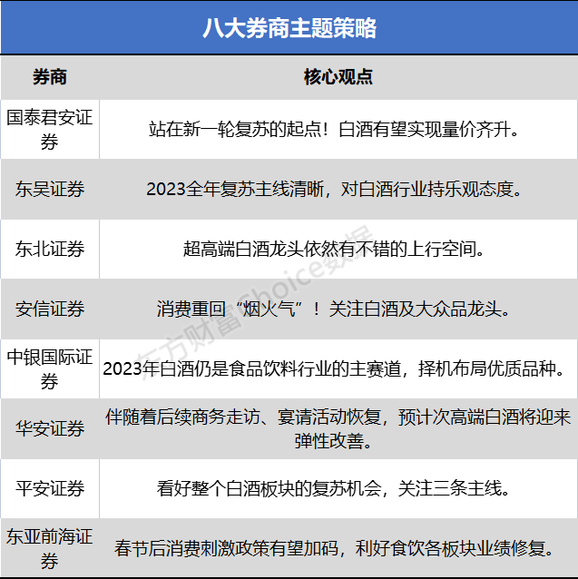国泰君安证券:站在新一轮复苏的起点!白酒有望实现量价齐升站在新一轮复苏的起点,我们认为多层次政策从居民收入、消费信心、场景打造等全方位促进消费恢复。同时地产融资端放松,将带动产业链崛起,制造业及投资端持续发力,经济复苏可期。压抑消费需求释放后,经济有望接力驱动消费复苏。白酒至暗时刻已过,春节动销良好。白酒与宏观经济及消费场景均具有较强关联性,将充分受益于政策拉动和经济复苏。受宏观经济影响,以及长期疫情对消费场景冲击,白酒艰难度过三年调整期,随着经济逐步回升以及消费场景恢复,白酒有望实现量价齐升。从酒企层面看对2023年定调良性发展和高质量增长,行业保持理性姿态迈过调整期,为回升奠定基础;从动销层面看,春节动销显著加快,高端和地产酒表现优异,未来次高端复苏可期。东吴证券:2023全年复苏主线清晰 对白酒行业持乐观态度全年复苏主线清晰,我们对全年持乐观态度。白酒行业长期消费升级趋势不变,2023年消费场景和消费意愿有望逐步恢复,复苏主线清晰,整体呈现弱动销和慢复苏→逐步加快的态势,当前板块长期价值显现,我们对2023年保持乐观态度。我们认为在全年在复苏主旋律下,有望出现阶段性的贝塔机会,价格从优重于择时,推荐:1)经济β推动角度重点推荐五粮液/泸州老窖;2)宴席场景复苏的角度重点推荐洋河股份/迎驾贡酒;3)受损次高端复苏的角度重点推荐舍得酒业。4)全年维度贵州茅台确定性最强,稳定性最高。站到当前时间点,从宏观层面看,外资将持续流入,消费成为拉动经济的中坚力量,我们预计消费政策将持续发力,同时防疫政策放松,消费场景复苏,随着第二第三波感染比例越来越低,食饮板块重点公司经营业绩边际改善确定。目前疫情高峰已过的区域中,消费情况复苏明显,叠加春节期间全国终端消费情况显著改善,近期地产酒动销超预期,同时超高端白酒龙头依然有不错的上行空间。对于白酒板块,防疫政策放开后,走亲访友和聚饮场景明显增加,叠加返乡潮带动,白酒消费整体表现好于原先预期,其中四川、河南、广东、江苏和安徽春节短周期维度表现优于同期。高端白酒和地产酒大众价格带需求旺盛,符合年前较好预期,高端中五粮液春节期间动销呈现个位数增长,江苏和安徽地产龙头动销实现正增长。经销商对于节后宴席回补和展望较为积极,相较年初信心更加充足,部分反馈春节期间库存消化明显,节后淡季有望呈现淡季不淡。次高端有望较快恢复,后续可加大次高端板块的配置比例,宴席回补和经济活动逐步活跃有望带来次高端板块全面复苏。当下优先推荐高端和地产酒龙头,推荐贵州茅台、五粮液、泸州老窖、古井贡酒、迎驾贡酒、洋河股份。对于啤酒板块,春节期间餐饮消费复苏超预期有望加速啤酒高端化。受原材料压力影响,行业掀起新一轮淡季提价潮,预计青啤和华润等厂商部分产品有望提价。建议重点关注消费持续复苏和提价带来的盈利改善。重点推荐青岛啤酒和华润啤酒,关注重庆啤酒的边际改善。安信证券:消费重回“烟火气”!关注白酒及大众品龙头通过草根调研七省市情况,我们发现疫情阴霾逐步退散,消费重回“烟火气”,商超客流量出现反弹,白酒及大众品动销快速恢复,部分产品出现缺货现象,货龄较去年也有所缩短。另外,礼赠、宴席等相关产品表现亮眼,旺季旺销得到验证,我们继续推荐白酒及大众品龙头。重点推荐:(1)白酒,板块投资、相对估值,当下重点推荐今世缘、五粮液等低估值标的,重点看好千元价格带竞争格局优化及复苏红利,如泸州老窖、山西汾酒、酒鬼酒等,业绩扎实标的继续推荐,如贵州茅台、古井贡酒、洋河股份等,经销商积极性改善后推荐次高端等渠道扩张标的,如舍得酒业等,关注改善型标的如老白干、伊力特等。(2)啤酒,高端化逻辑仍在延续,板块具有强阿尔法,推荐燕京啤酒、青岛啤酒、重庆啤酒、华润啤酒;(3)旺季动销改善明显,大众品困境反转逻辑确立,其中竞争力强的龙头表现强于行业,继续推荐绝味食品、天润乳业、千味央厨、立高食品、海天味业、千禾味业、盐津铺子等,建议关注甘源食品、劲仔食品。中银国际证券:2023年白酒仍是食品饮料行业的主赛道 择机布局优质品种(1)我们在此前年度策略中提到,2023年行业复苏分为两个阶段,第一阶段是消费场景恢复,第二阶段是消费能力的恢复,预计未来几个季度业绩将呈现出逐步提速的迹象。虽然近期股价反弹,估值有明显的回升,从历史上食品饮料股价表现来看,趋势比估值更重要。在趋势持续向好的背景下,市场对估值的容忍度较高。(2)白酒,2023年仍是食品饮料行业的主赛道,择机布局优质品种。经历了12月的低谷之后,1月上旬白酒需求有所恢复,预计春节期间将接近正常水平。1 月上旬需求环比明显改善,渠道信心开始恢复,随着第一轮疫情高峰期过去,再叠加返乡人数大增,预计春节期间需求可接近正常水平。重点推荐山西汾酒、今世缘、五粮液、贵州茅台。(3)大众品,短期关注消费场景正常化的机会,包括软饮料、乳制品、休闲卤制品,长期看好速冻食品和低温白奶的成长空间。春节期间走亲访友的活动增多,植物蛋白饮料礼赠占比较高,需求有望明显反弹,如承德露露。另外,2023年春节乳制品的礼赠需求也有望明显复苏。休闲卤制品,疫情加速了行业洗牌,龙头市占率进一步