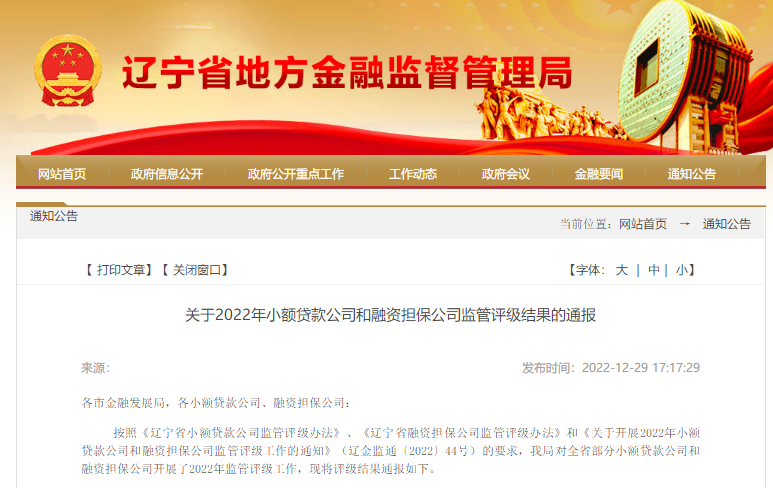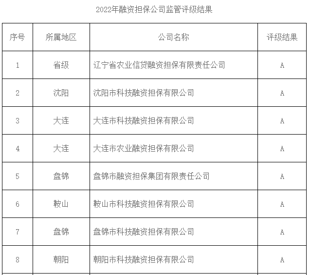 辽宁农担公司获评辽宁省2022年融资担保公司分类监管评级A级