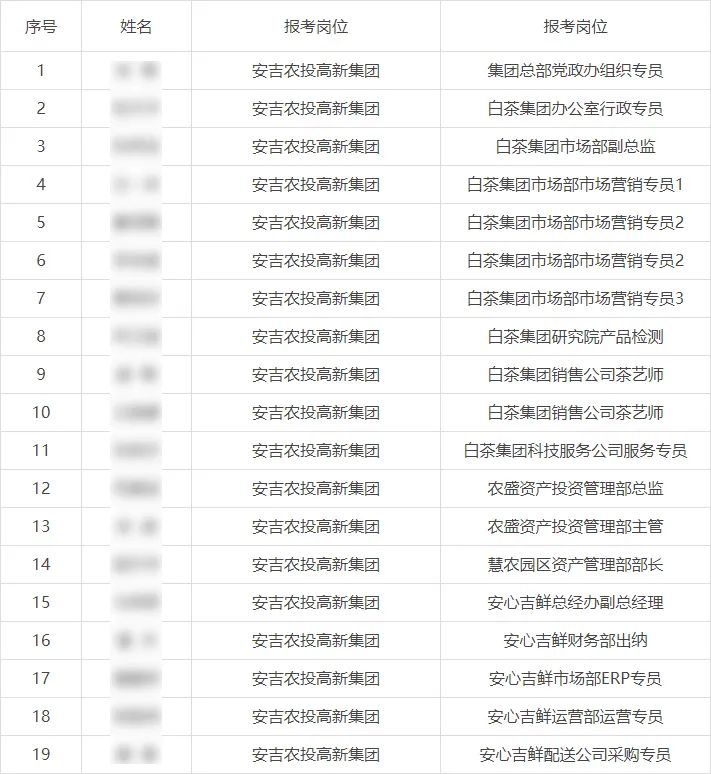 根据《浙江安吉农投高新集团有限公司及下属子公司招考公告》要求,经报名、资格审查、笔试(笔试及技能测试、面谈)、面试、体检、考察等一系列相关程序,拟录用19名同志,现予以公示。