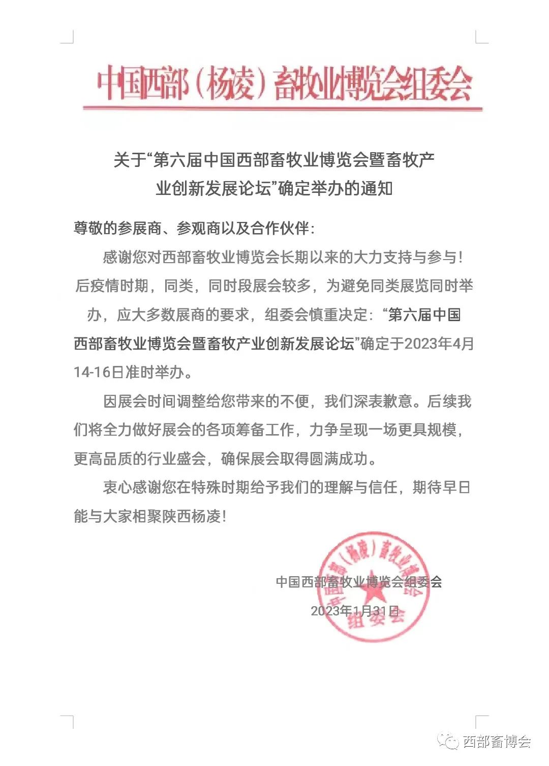 2023年第六届中国西部畜牧业博览会暨畜牧产业创新发展论坛确定举办时间通知
