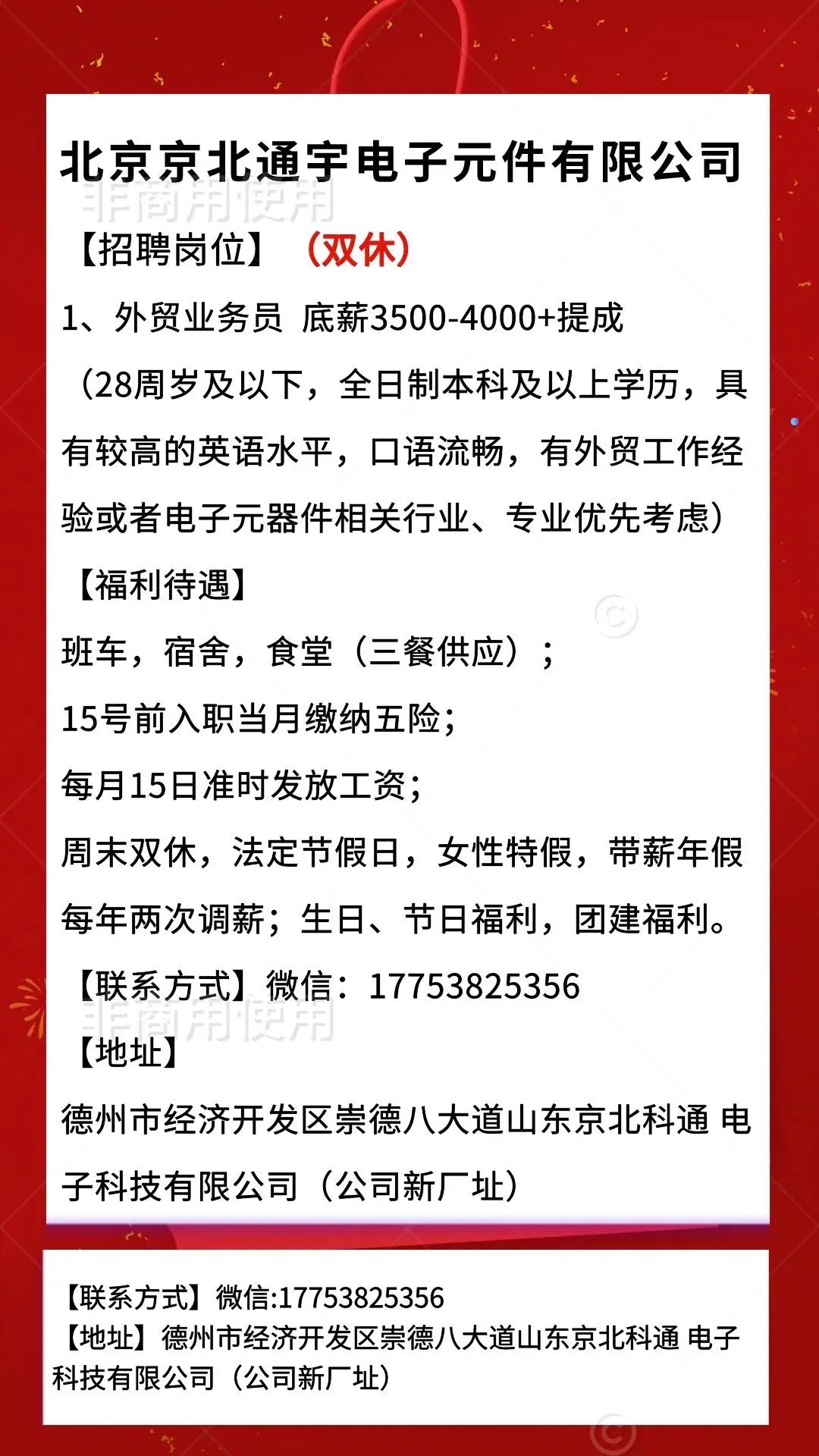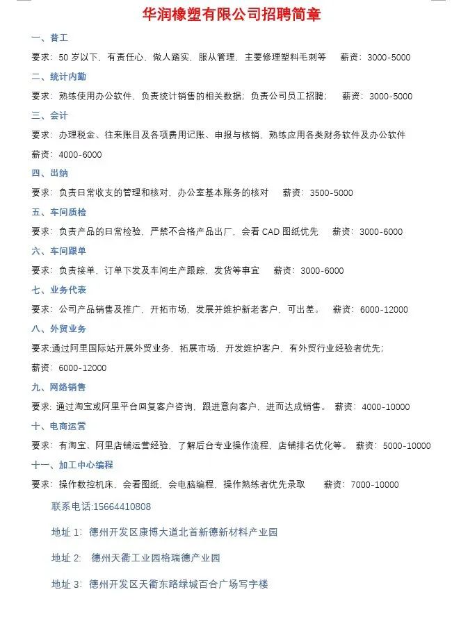 1、销售经理、销售员、技术支持各2人,有销售经验或了解制冷、暖通行业,40岁以下,能驻外。2、企管员1人,男性,35岁以下,本科或硕士学历,有企管、内审、精益管理等工作经验者可放宽学历。本科及以上学历,3年以上工作经验,熟练使用CAD、SW,优秀者可放宽学历。以上岗位提供食宿,地址:德州市崇德十三大道,电话15505347600(微信同号)1.人资经理1名,负责人资部门相关工作,薪资面谈;5.禹城县城、德州铁西以岭药业附近、乐陵县城、各招聘电梯维修技能工1名,学历不限,经验不限,有师傅带,岗位工资+绩效+岗补,有宿舍,福利待遇好,以上岗位一经录用,待遇优厚,入职满三个月缴纳五险一金,公司提供免费宿舍、享受公司节假日福利,每周单休、每日八小时工作制,节假日休息工作时间:8:00-12:00,13:00-17:001、氩弧焊焊工,60周岁以下,综合工资8000-12000;2、普工,18-55岁,辅助焊工工作,19元/小时;每天9小时,早8晚5,月休4天,有食堂管三餐,住宿六人间1、男女车间普工基本工资加全勤加提成,可通过学习晋级工资技工,中级技工。要求40岁以下,一月两天公休,月收入3000_5000左右,有节日福利待遇。有食品加工经验优先,退役士兵优先,在天衢工业园附近居住的优先,要求有上进心责任心,身体健康,吃苦耐劳。 2、招聘车间内勤1名,化验员1名,能熟练使用办公软件 ,身体健康有责任心,有食品检测经验优先录取。电话:秦经理13793454524 马经理132109966001、协助上级领导对公司整体发展规划进行落地,随时监督并反馈结果;2、协助上级领导对整体运营板块的相关部门进行管理,包含体系搭建、制度建立以及业务流程梳理完善等工作;3、协助上级领导对具体管理工作进行布置、实施、检查、督促、落实执行;5、负责公司人事行政管理工作,包括考勤管理,请假管理等;协调各部门工作,处理日常事务;负责公司环境卫生、管理的工作;6、负责公司文件的拟定、审核、登记、存档等,并配合各部门做好呈批文件的上报及下发工作;9、负责编写公文,会议纪要、规章制度并督办会议决策事项;10、负责公司固定资产、办公用品、低值易耗品的管理工作;11、负责办理公司各项证照的登记、变更、续期、年检、注销等手续。联系时间:早8:00--下午18:00其他时间勿扰(可添加微信)工作地点:德州经济技术开发区乐普大道与天衢东路路口处招聘店员数名:年龄18-40岁,有亲和力,有责任心、沟通能力强,学习能力好(提供住宿) 底薪3000+200全勤奖+2天休班+提成 三班倒,九小时(三个月后底薪3300)综合工资4500+ 地址:德州市六个樱桃精品水果超市(高地店),六个樱桃(赵辛店),六个樱桃(东方家园店) 底薪+提成,综合薪资4-8k,周末单休。福利待遇多多地址:月亮湾小区东一个路口往南100米山东汝隆建筑安装工程有限公司院内。招聘店员2名,年龄30-43岁,女,上班时间早8-12点下午1.30到5.30,周末公休一天,法定节日休息 年龄45周岁以下,上班时间早上六点至中午二点,工资:2500—3000,有经验者优先考虑1、操作男工1名,45周岁以内,可接受加班,工作轻松简单,白班+加班或两班倒综合月入5000-8000;2、厨师1名,身体健康,不吸烟,要求有50人员工食堂厨师经验,午饭为主,薪资面议;3、销售经理2名,中专及以上,有厂家大客户经验,接受短期出差;高底薪+高提成,综合月入10000+;五险一金,免费食宿,生日蛋糕,工龄奖,过节福利,各种奖励,员工礼金等。地址:德州经济开发区三八东路5258号(中德加油站东临)1.招聘销售导购3名,有经验者优先,无经验可培训。1.缴纳五险2.员工生日3.假日礼品4.定时团建5.每年体检6.每周单休。要求:年满18-35周岁,不限学历,不限经验,普通话流利,会基本的电脑操作,具有良好的沟通理解能力、语言亲和力强,工作态度端正,有过类似工作经验者优先录用。工作内容:负责接听中国移动10086人工热线人工服务热线,为客户提供专业性的业务咨询解答、生活资讯查询、增值业务办理、投诉处理等业务。工作时间:每天工作8小时,月休5~6天,能适应轮班工作(没有大夜)待遇:最高底薪2800+绩效+通话时长奖励,月综合工资3000~6000左右,带薪培训,可提供住宿、五险等。招聘运营店长,录入员,理货员,收银员?有能力,有责任心,高薪聘请1、男女车间普工基本工资加全勤加提成,可通过学习晋级工资技工,中级技工。要求40岁以下,一月两天公休,月收入3000_5000左右,有节日福利待遇。有食品加工经验优先,退役士兵优先,在天衢工业园附近居住的优先,要求有上进心责任心,身体健康,吃苦耐劳。 2、招聘车间内勤1名,化验员1名,能熟练使用办公软件 ,身体健康有责任心,有食品检测经验优先录取。电话:秦经理13793454524 马经理13210996600。1、网络电销经理50名(男女不限)有老人带新人 底薪+提成,每月轻松过万 2、招聘业务经理20名(男女不限2045岁)有老业务带新业务,上手快,会开车。 1、诚聘平面设计3名,能熟练使用CDR或PS或AI其中一种,对工作认真负责; 2、客服4,,不是销售类客服,不用打电话;无工作经验也可以。 以上岗位工作时间8小时,试用期工资3000,工资准时发放。隶属于德州市残疾人联合会,成立于2020年7月,由夏津县特殊教育学校举办。中心主要围绕智力、语言发育障碍或迟缓者,进行言语、认知康复与教育工作。中心是市残联认定的三级智力康复定点机构。招聘教师3名,具体要求:大专及以上学历,学前教育、康复教育专业。 以上人员均须遵纪守法,热爱特教事业,具备