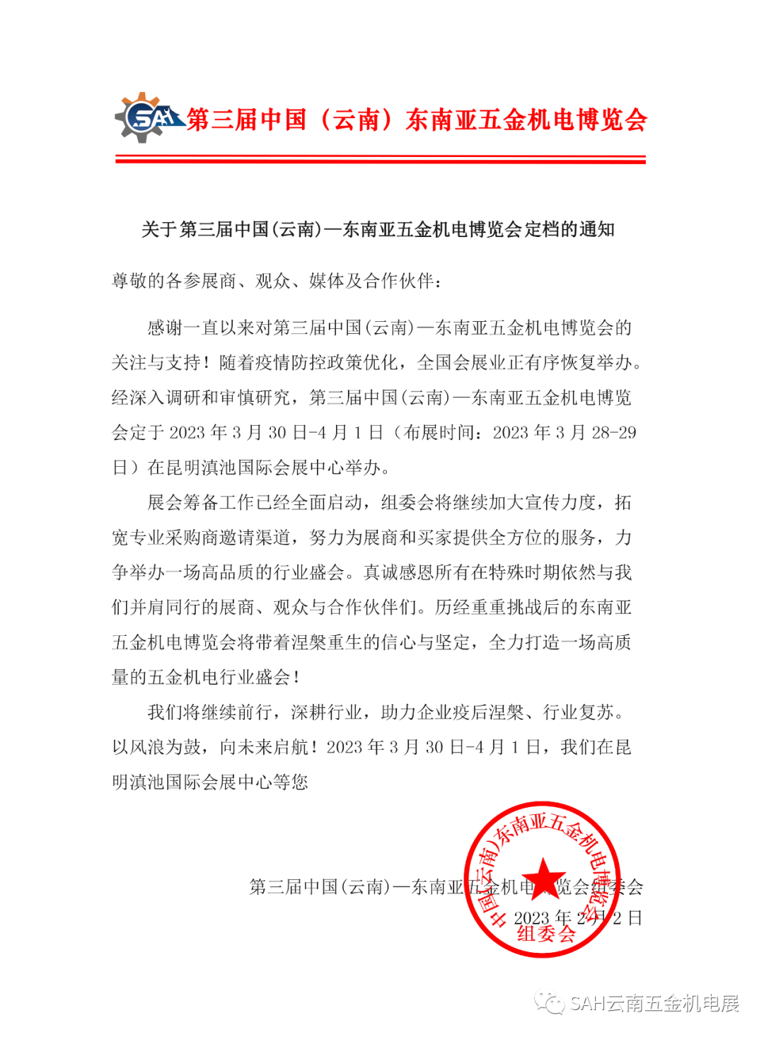 感谢一直以来对第三届中国(云南)—东南亚五金机电博览会的关注与支持!随着疫情防控政策优化,全国会展业正有序恢复举办。经深入调研和审慎研究,第三届中国(云南)—东南亚五金机电博览会定于2023年3月30日-4月1日(布展时间:2023年3月28-29日)在昆明滇池国际会展中心举办。展会筹备工作已经全面启动,组委会将继续加大宣传力度,拓宽专业采购商邀请渠道,努力为展商和买家提供全方位的服务,力争举办一场高品质的行业盛会。真诚感恩所有在特殊时期依然与我们并肩同行的展商、观众与合作伙伴们。历经重重挑战后的东南亚五金机电博览会将带着涅槃重生的信心与坚定,全力打造一场高质量的五金机电行业盛会!我们将继续前行,深耕行业,助力企业疫后涅槃、行业复苏。以风浪为鼓,向未来启航!2023年3月30日-4月1日,我们在昆明滇池国际会展中心等您