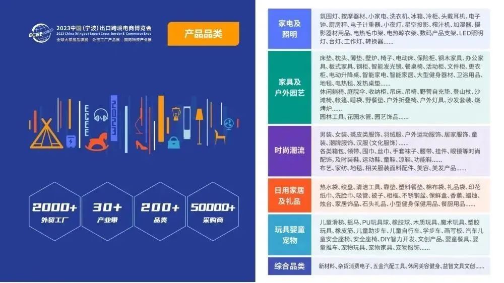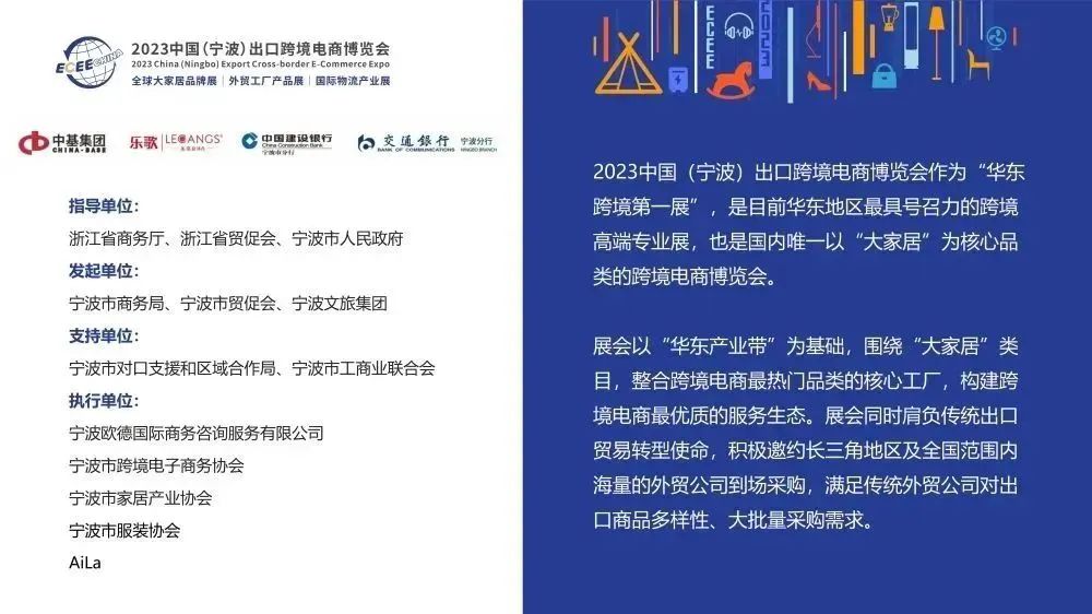 2023中国(宁波)出口跨境电商博览会作为“华东跨境第一展”,是目前华东地区最具号召力的跨境高端专业展,也是国内唯一以“大家居”为核心品类的跨境电商博览会。