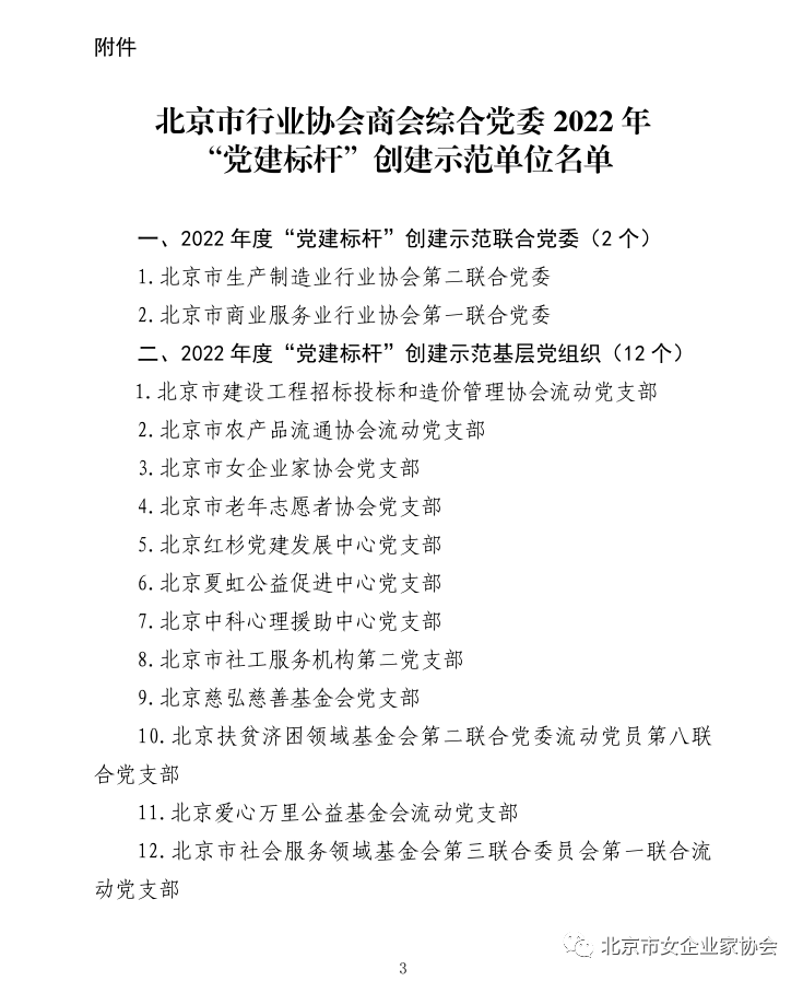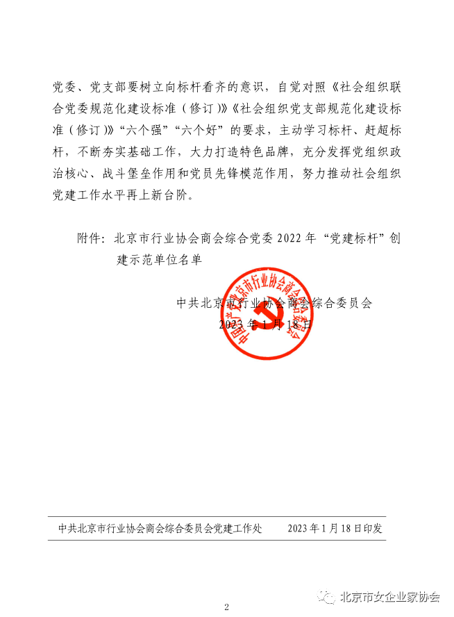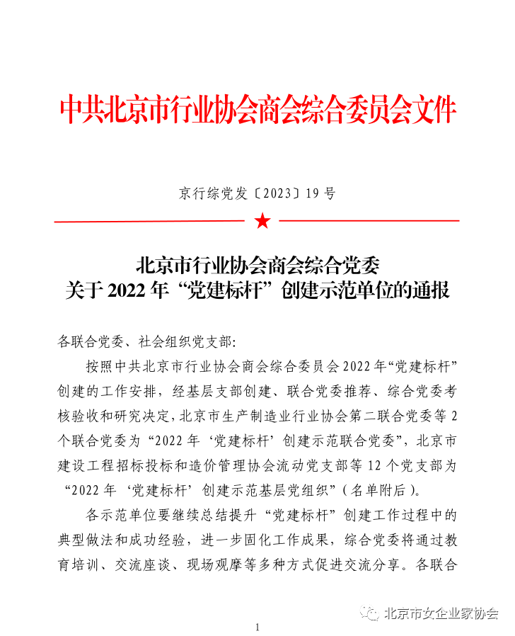 今日收到中共北京市行业协会商会综合党委2023年1月18日印发的《关于2022年“党建标杆”创建示范单位的通报》。按照中共北京市行业协会商会综合委员会2022年“党建标杆”创建的工作安排,经基层支部创建、联合党委推荐、综合党委考核验收和研究决定,在中共北京市行业协会商会综合委员会下设的52家联合党委,1122个党支部中评选出中共北京市女企业家协会党支部等12个党支部为“2022年‘党建标杆’创建示范基层党组织”。