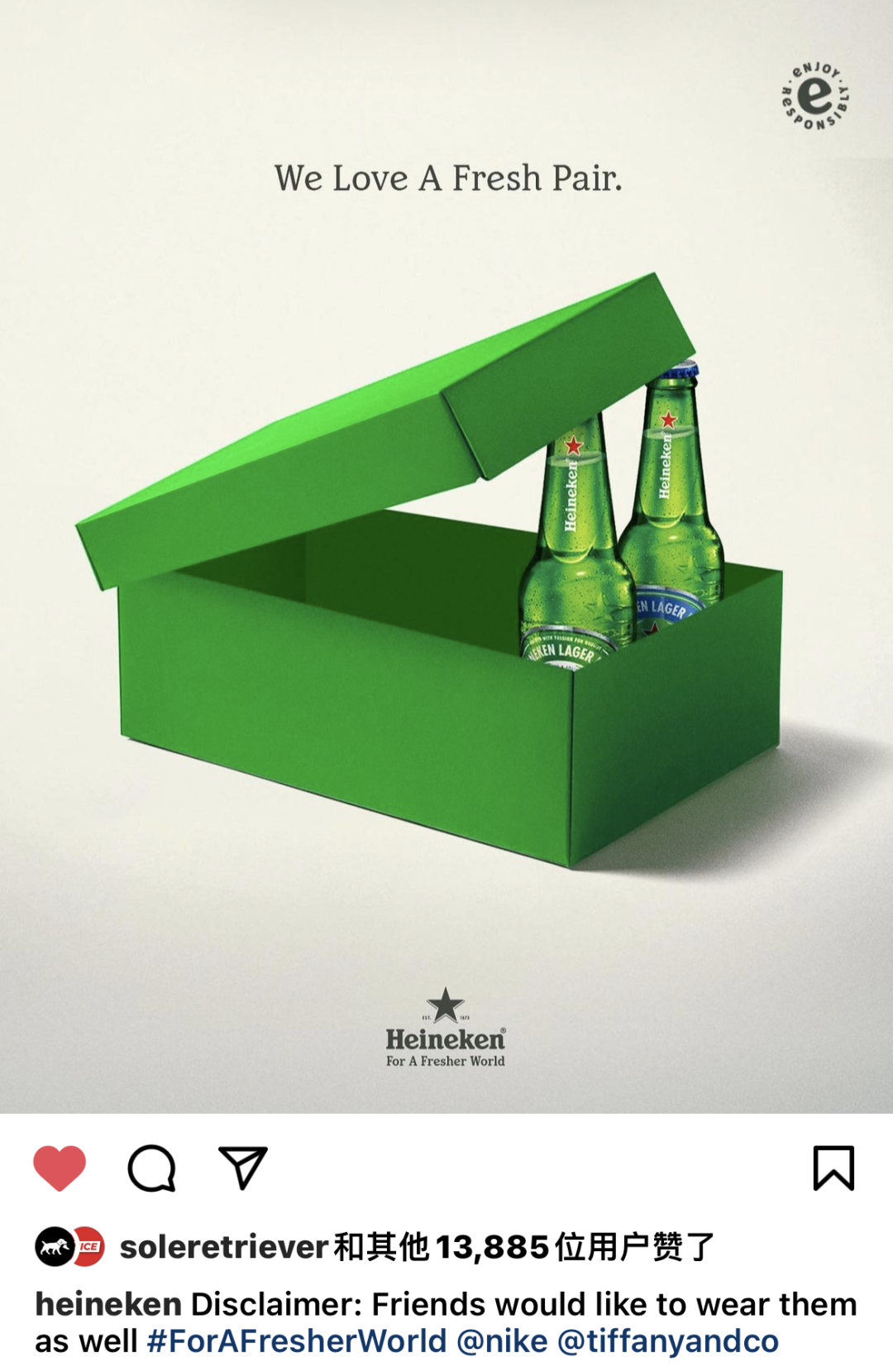 前两天,喜力啤酒官方在社媒平台发布了一张官宣海报,与 Tiffany & Co. x Nike Air Force 1 Low 合作消息同一时间,并@了两个合作品牌,不禁让大家猜测三个品牌是否会有合作。
