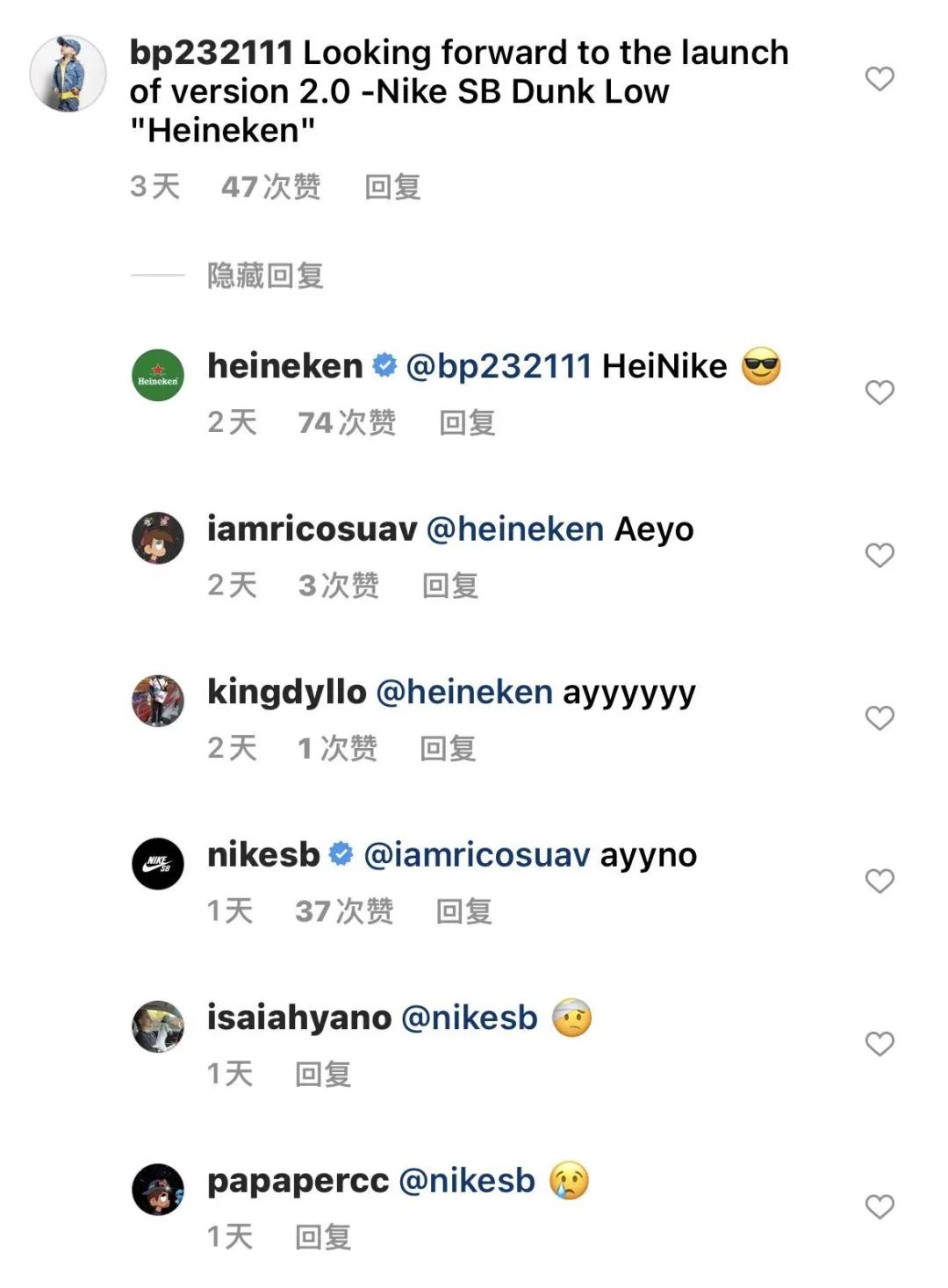 而之后,Nike SB 官方下场回复评论,否认鞋款为 SB Dunk Low ,但也暗示了联名消息属实。