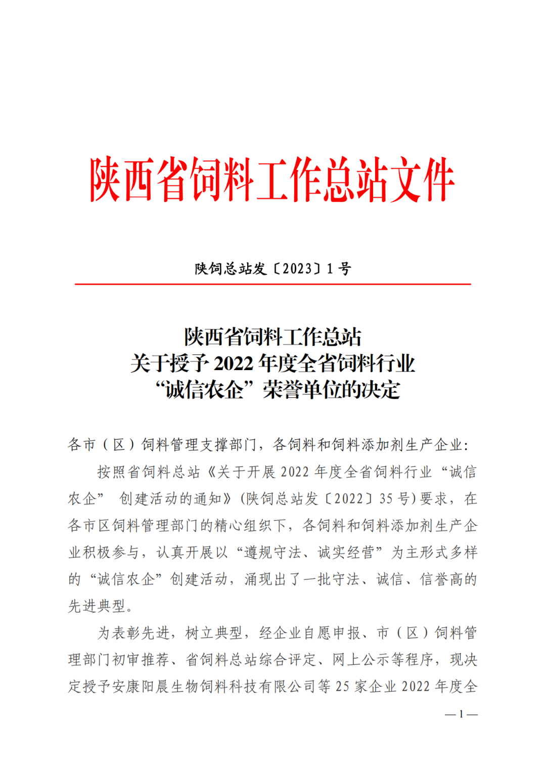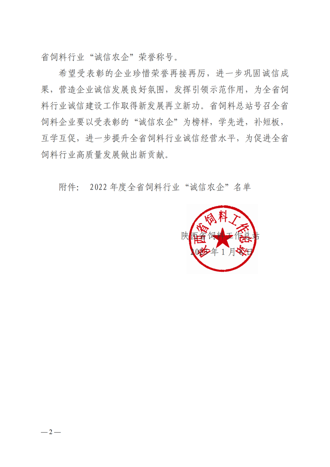 附件:陕饲站发【2023】1号 2022年度诚信农企表彰.pdf
