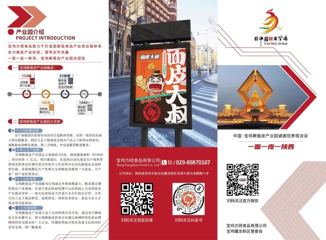 宝鸡方硕食品有限公司作为行业的后起之秀,重点着力于产品的推陈出新以及技术改革,公司联合西北农林科技大学开展“擀面皮抗淀粉老化”研究,并历时两年研发其自有品牌“面皮大叔”简食自热擀面皮产品,为擀面皮无需复热,开袋即食创造实验基础,同时企业不断优化产品结构,从口味与形态上进行创新与优化。公司针对时尚消费新人群,通过更时尚的传播、更便捷的包装、更强势的推广三个方面,树立宝鸡擀面皮更年轻时尚、更贴近生活的产品新形象。