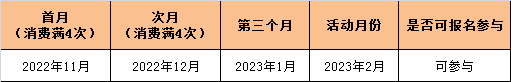 4、抽签当月2023年2月份向前推算3个月内,于2022年11月、2022年12月连续2个自然月,每个月在夏商集团零售终端全渠道(厦门夏商百货、三明夏商百货、龙岩夏商百货、南平夏商百货、厦门夏商民兴超市、厦门夏商酒业、厦门夏商多点)消费次数达到4次(含)以上(消费次数按照单终端计算,一天内多次消费的,仅计算1次消费次数,退货或已经取消的订单不计入消费次数);