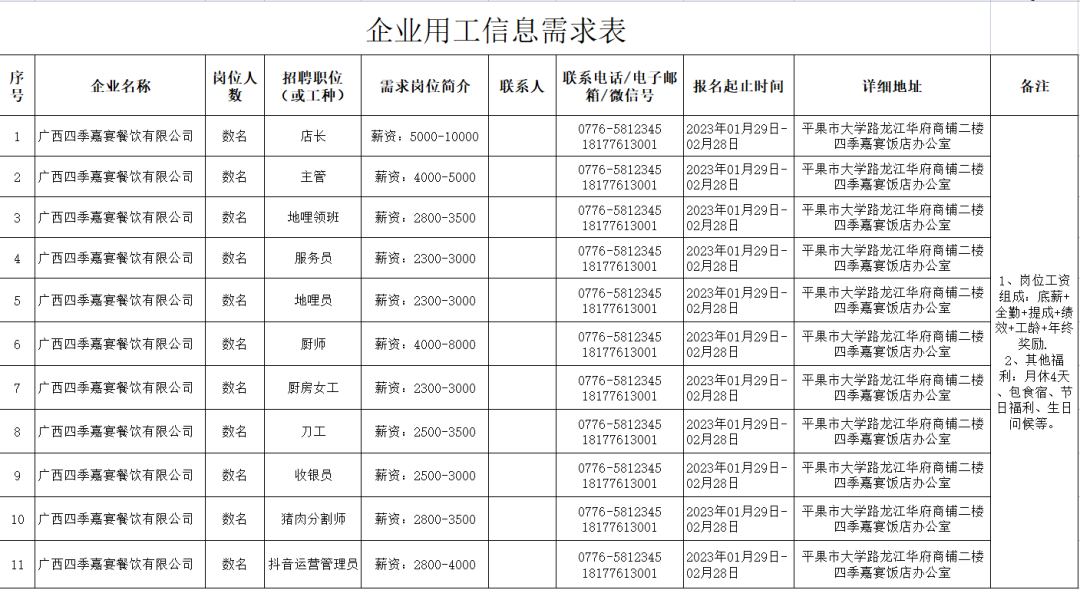为贯彻党中央、国务院稳就业保就业决策部署,服务保民生、兜底线、救急难,平果市人社局、平果市产业工人服务中心组织开展主题为“援助暖民心 就业解民忧”的就业援助“暖心行动”,为就业困难人员送岗位、送服务、送政策、送温暖,帮扶困难人员实现就业,本期为广西四季嘉宴餐饮有限公司招聘专场,欢迎广大求职者踊跃关注应聘!最终用人岗位招聘信息以企业为准!