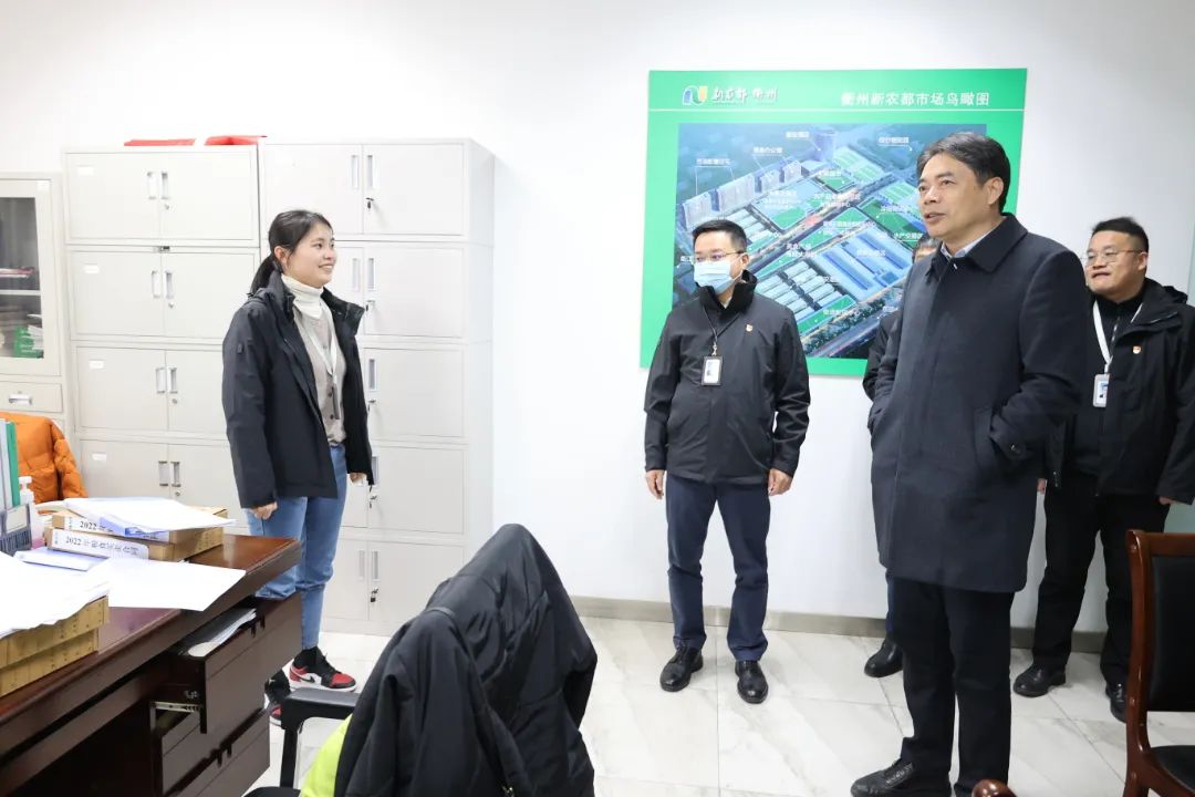 2月2日,新农都公司党委书记、董事长沈金潮,总经理单晓东,党委副书记王伟松率相关职能部门负责人到衢州新农都调研指导新年度工作并看望慰问一线在岗干部员工,新农都公司党委委员、副总经理兼衢州公司董事长张春及公司领导班子成员陪同。
