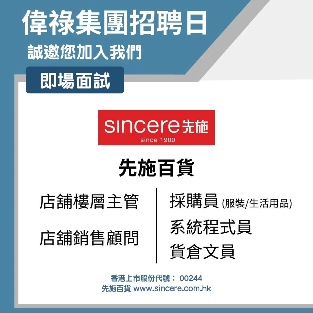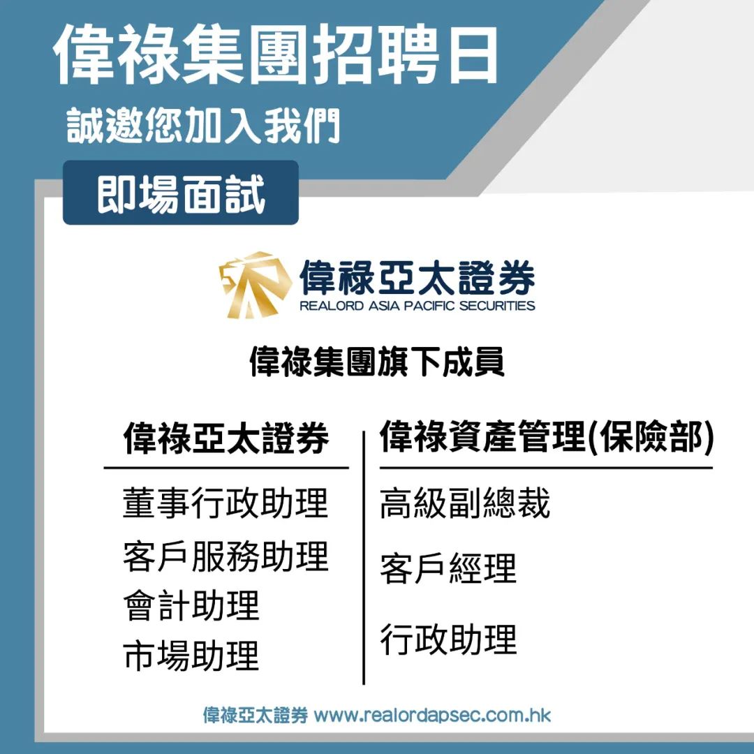 伟禄集团(01196.HK)致力于创新发展,追求卓越,业务包括金融服务、物业投资、汽车零件销售、环保产业及百货等。为配合未来的发展路向及营运需要,我们将举办“伟禄集团招聘日”,届时将为求职者提供即场面试,期待与各位见面!时间:上午10:00-12:00及下午14:00-16:30职位种类:包括会计、行政、资产管理、信息科技、采购、店铺销售、市场助理及顾客服务等前“兔”似锦,职等你来