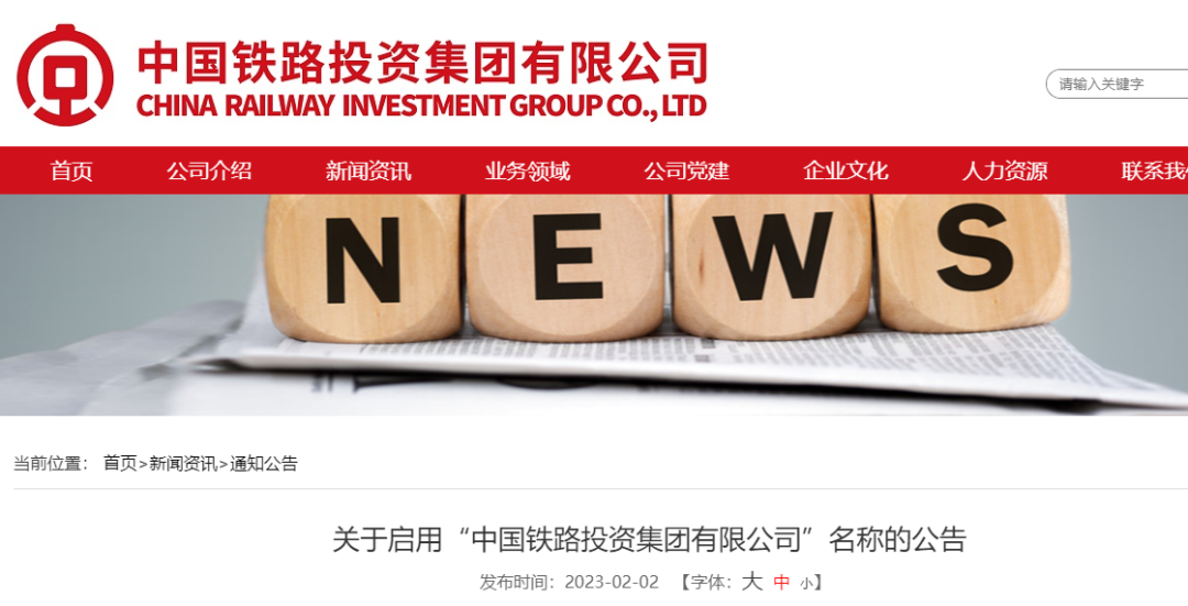 2月1日,中国铁路投资集团有限公司官网发布关于启用“中国铁路投资集团有限公司”名称的公告:按照中国国家铁路集团有限公司(以下简称国铁集团)党组决策部署,经北京市市场监督管理局核准,自2023年2月1日起,“中国铁路投资有限公司”正式更名为 “中国铁路投资集团有限公司”,集团名称为“国铁投资集团”。