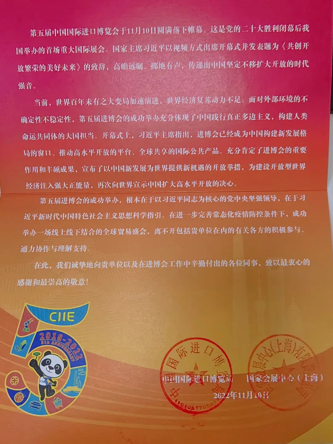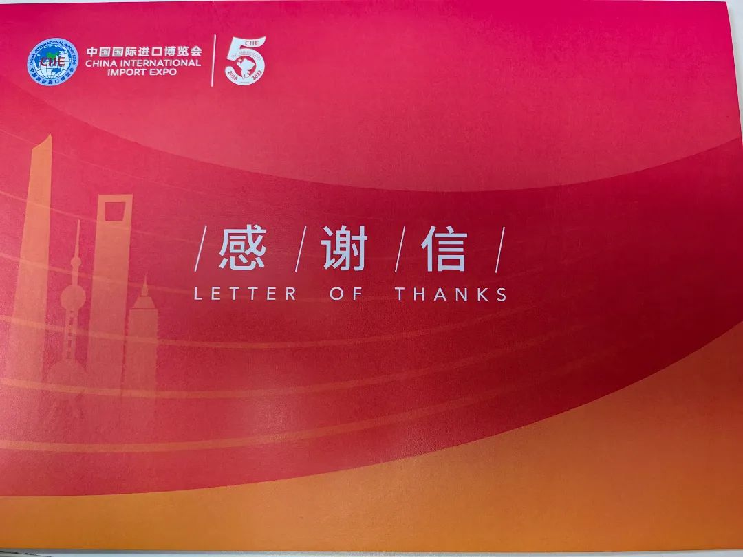 由于进博会期间表现优异,蔡易辰收到了进博会相关单位送出的感谢信。