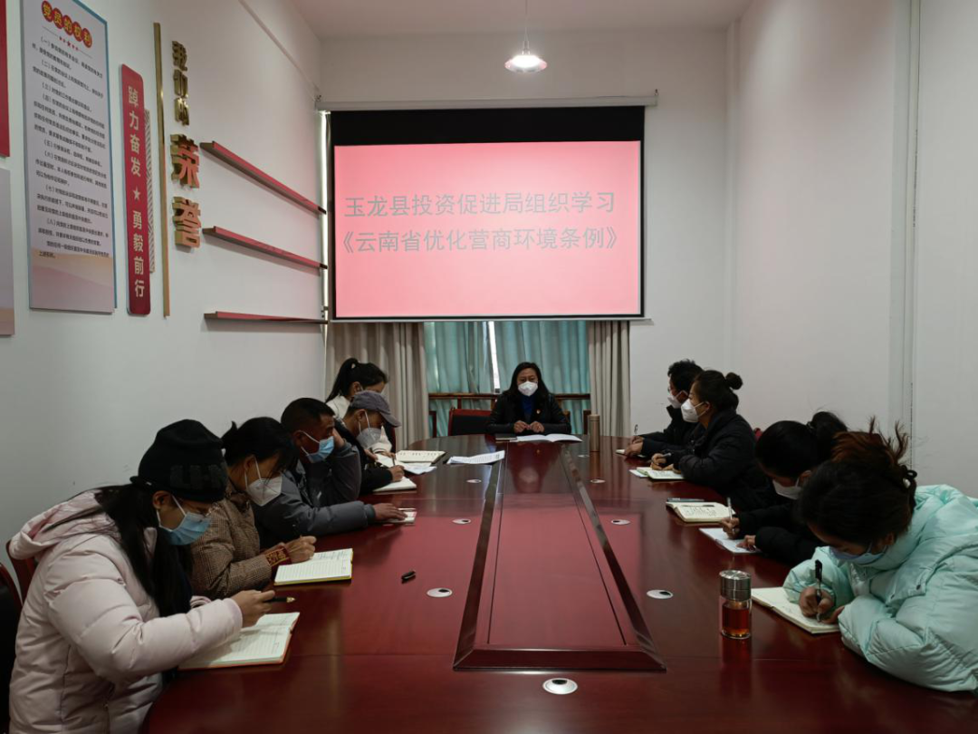 为持续优化法治化营商环境,激发市场活力,不断推动党员干部转变观念作风,提升服务质效,加快构建党建引领优化营商环境新格局。1月16日,玉龙县投资促进局召开《云南省优化营商环境条例》专题学习会,局长和愿平主持会议,全体干部职工参加会议。