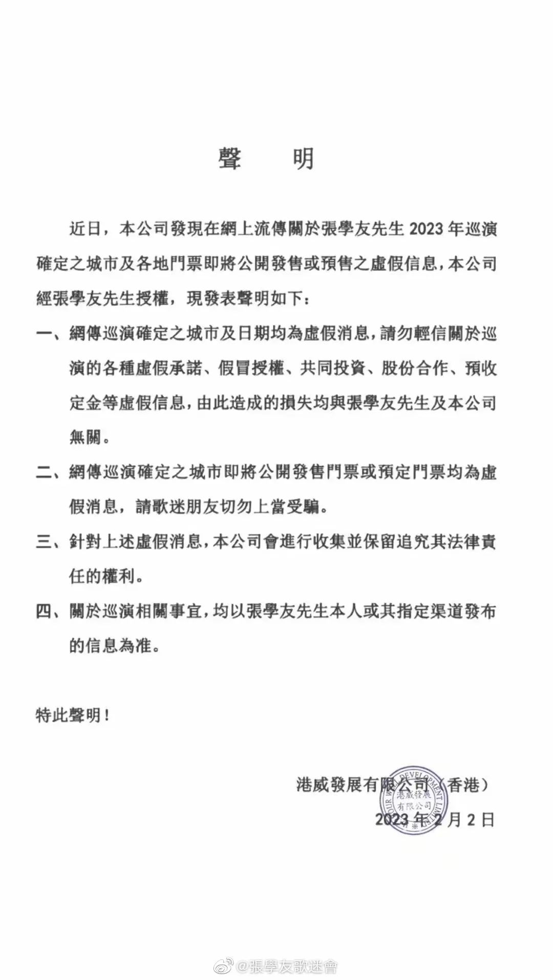 一、網傳巡演確定之城市及日期均為虛假消息,請勿輕信關於巡演的各種虛假承諾、假冒授權、共同投資、股份合作、預收定金等虛假信息,由此造成的損失均與張學友先生及本公司無關。