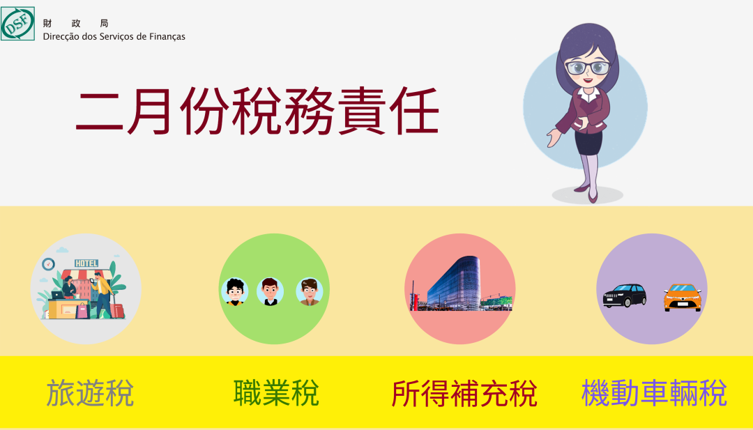 職業稅 | - | 第一組納稅人(受僱人士)遞交M/5格式申報書,載明上年度所收受或交由其處置的一切薪酬或收益(經由第267/2003 號行政長官批示,並於二零零三年十二月一日重新公佈二月二十五日第2/78/M號法律第十條第一款)。第九條或特別法例所指豁免職業稅之人士,倘並無從其他工作來源獲得收益,可無須遞交申報書;又第一組納稅人,當其報酬是從唯一的僱主處獲得時,亦可免交申報書。 |