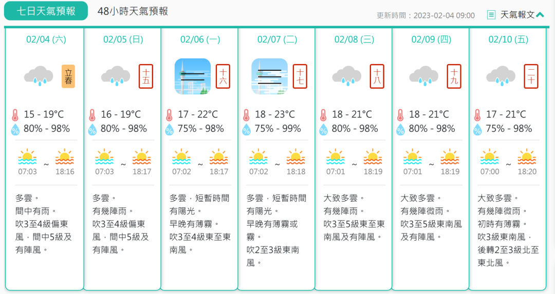 多雲。間中有雨。吹3至4級偏東風,間中5級及有陣風。 氣溫約為攝氏15至19度。 相對濕度介乎百分之80至98之間。預測最高紫外線指數約為 3,級別屬於中等。