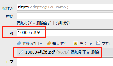 7.个人征信报告(近3个月内),发送至rlzpzx@126.com,邮件主题命名格式为:报名序号+姓名,邮寄附件命名格式为:报名序号+姓名。如图: