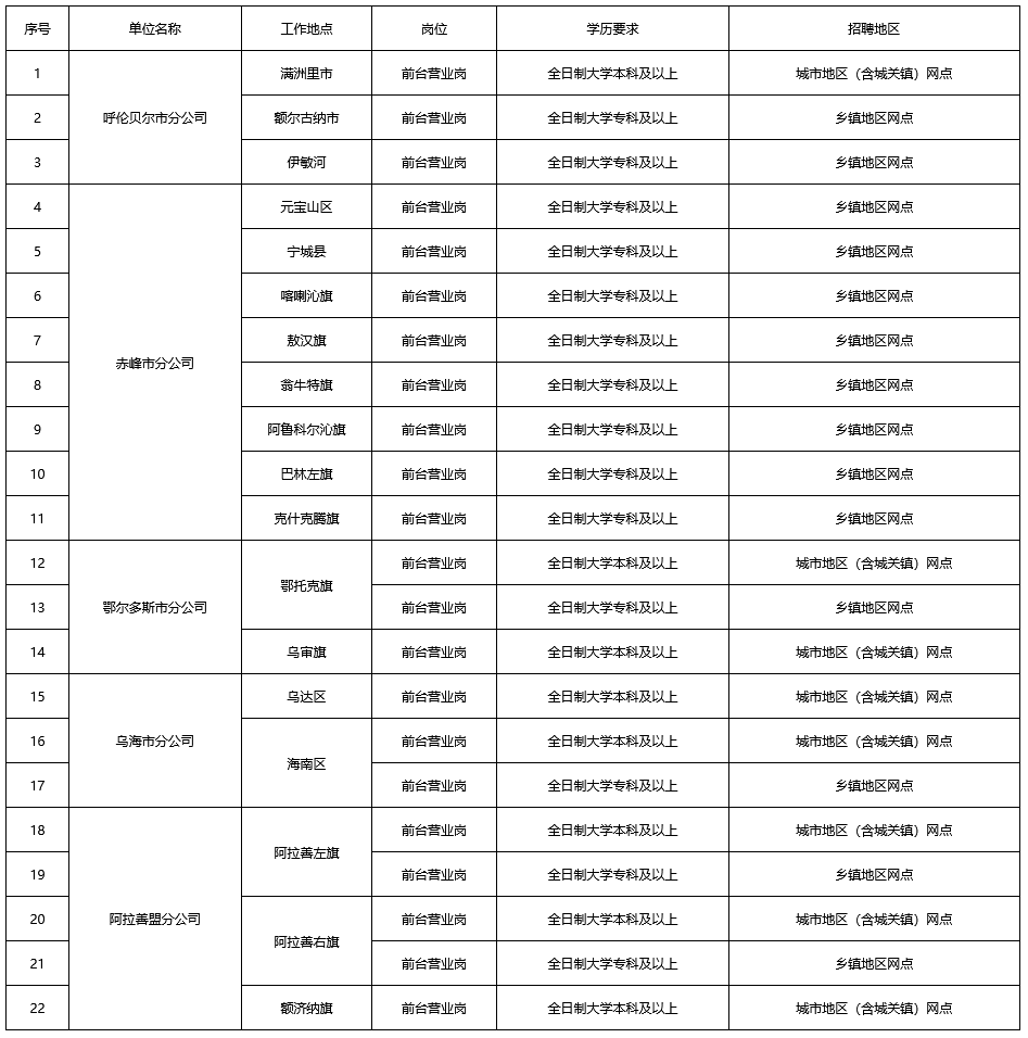 呼伦贝尔市分公司、赤峰市分公司、鄂尔多斯市分公司、乌海市分公司、阿拉善盟分公司城市地区(含城关镇)、乡镇地区营业网点。