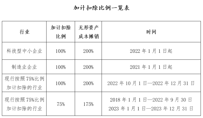 现行适用研发费用税前加计扣除比例75%的企业,在2022年10月1日至2022年12月31日期间,税前加计扣除比例提高至100%。三、中小微企业新购置500万以上设备器具,按比例扣除中小微企业在2022年1月1日至2022年12月31日期间新购置的设备、器具,单位价值在500万元以上的,按照单位价值的一定比例自愿选择在企业所得税税前扣除。其中,企业所得税法实施条例规定最低折旧年限为3年的设备器具,单位价值的100%可在当年一次性税前扣除;最低折旧年限为4年、5年、10年的,单位价值的50%可在当年一次性税前扣除,其余50%按规定在剩余年度计算折旧进行税前扣除。四、小型微利企业应纳税所得额100万元以内部分,实际税负2.5%对小型微利企业年应纳税所得额不超过100万元的部分,减按12.5%计入应纳税所得额,按20%的税率缴纳企业所得税。也就是说,不超过100万部分的实际税负仅为2.5%!政策执行期间为2021年1月1日至2022年12月31日。注意:从业人数是指与企业建立劳动关系的职工人数和企业接受的劳务派遣用工人数之和。自2019年1月1日至2022年12月31日,企业通过公益性社会组织或者县级(含县级)以上人民政府及其组成部门和直属机构,用于目标脱贫地区的扶贫捐赠支出,准予在计算企业所得税应纳税所得额时据实扣除。在政策执行期限内,目标脱贫地区实现脱贫的,可继续适用上述政策。02