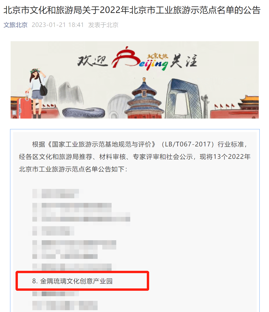 近日,北京市文化和旅游局发布关于2022年北京市工业旅游示范点名单的公告,根据《国家工业旅游示范基地规范与评价》(LB/T067-2017)行业标准,经各区文化和旅游局推荐、材料审核、专家评审和社会公示,共有13个评选为2022年北京市工业旅游示范点。我区金隅琉璃文化创意产业园获评为“2022年北京市工业旅游示范点”称号。
