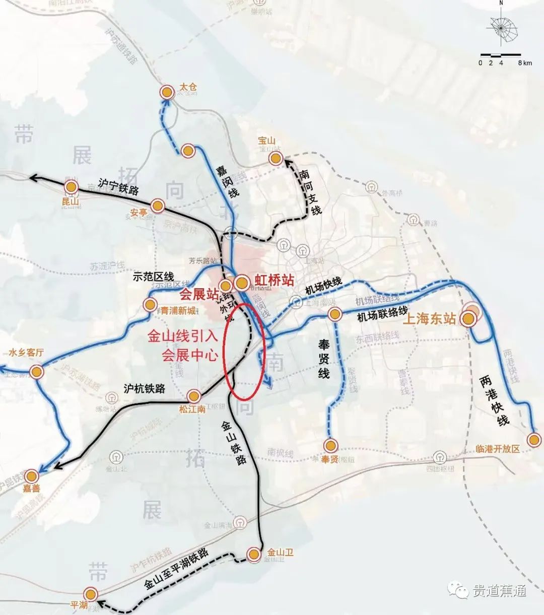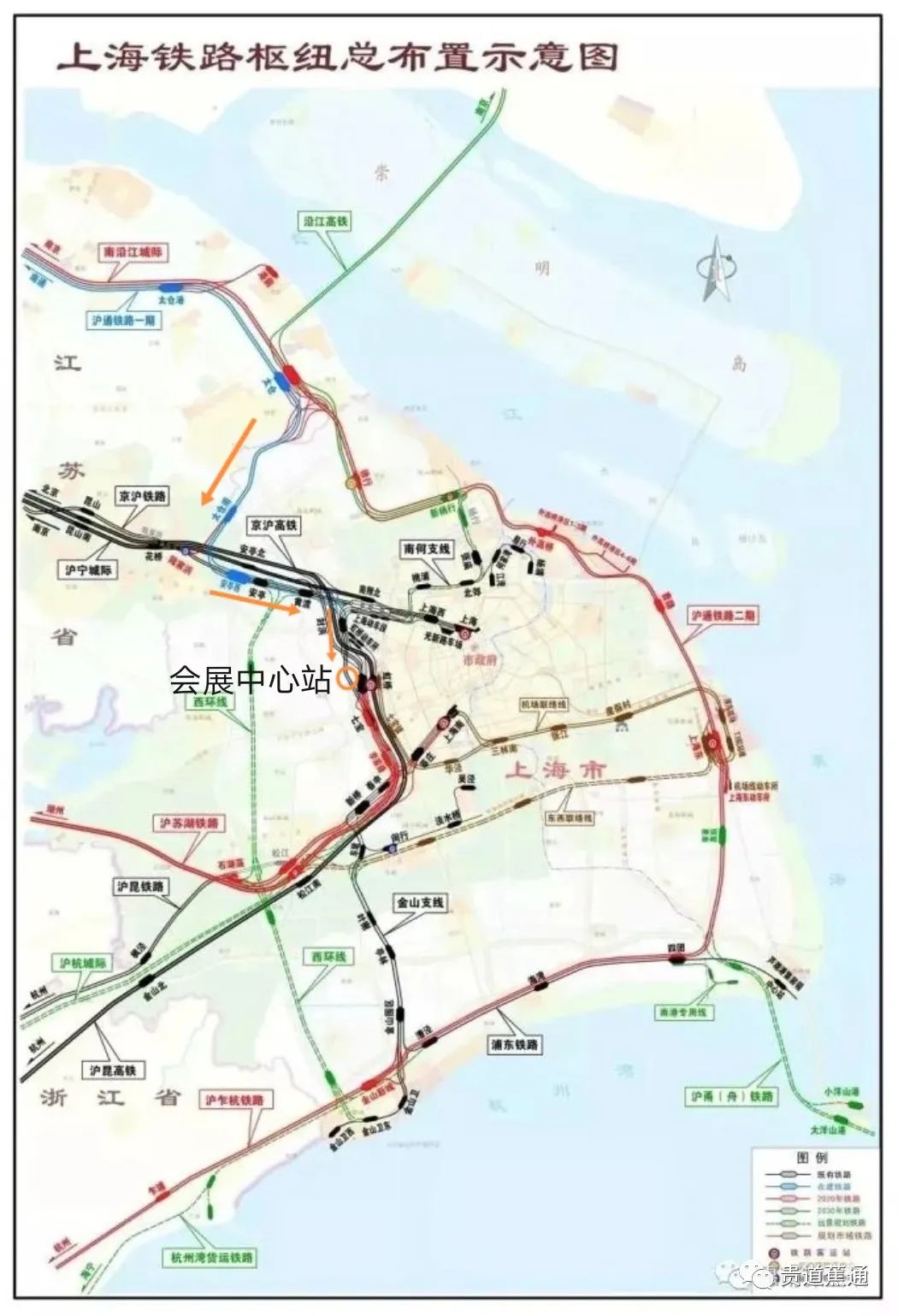 其中点名沪苏通铁路、南沿江高铁、沪渝蓉高铁。它们进入虹桥均需经过封浜站,可以平顺转到沪杭外环线上的会展中心站。