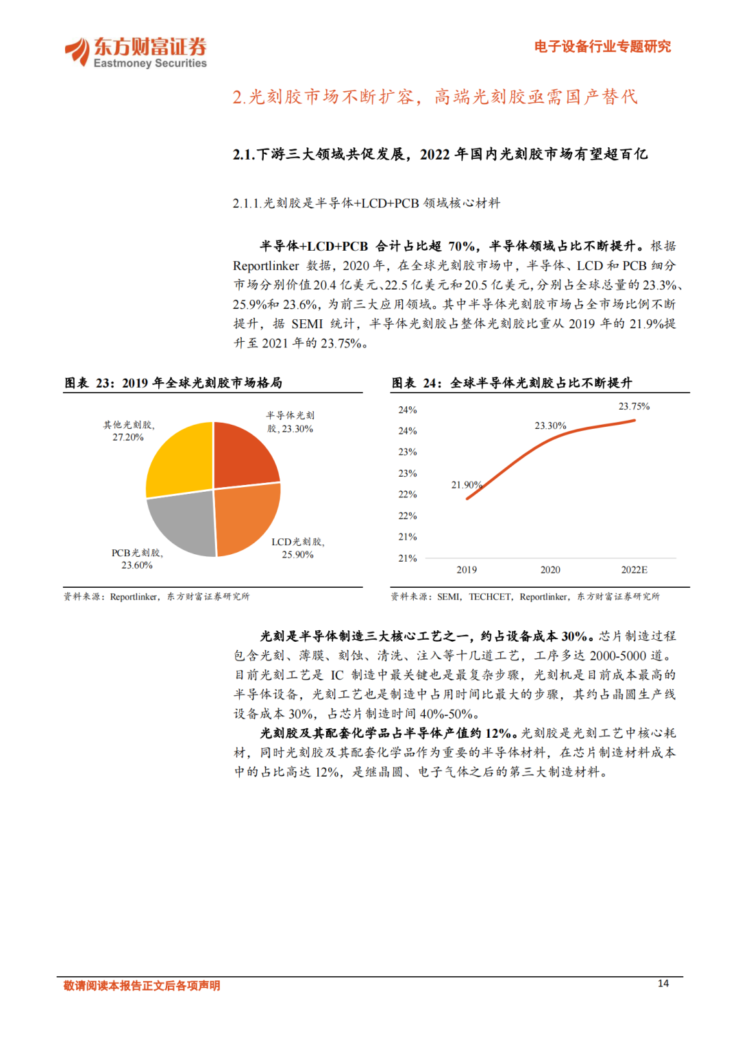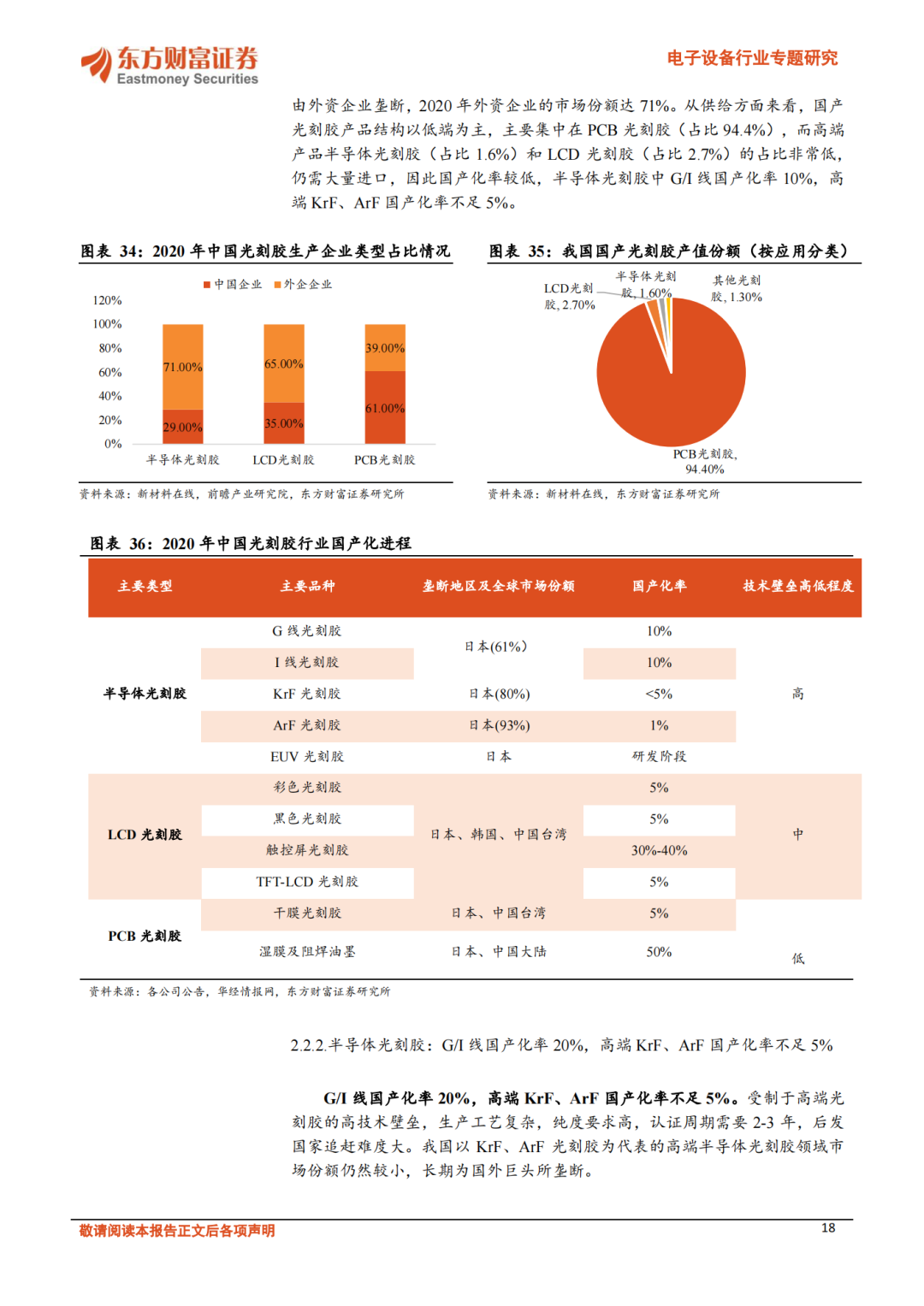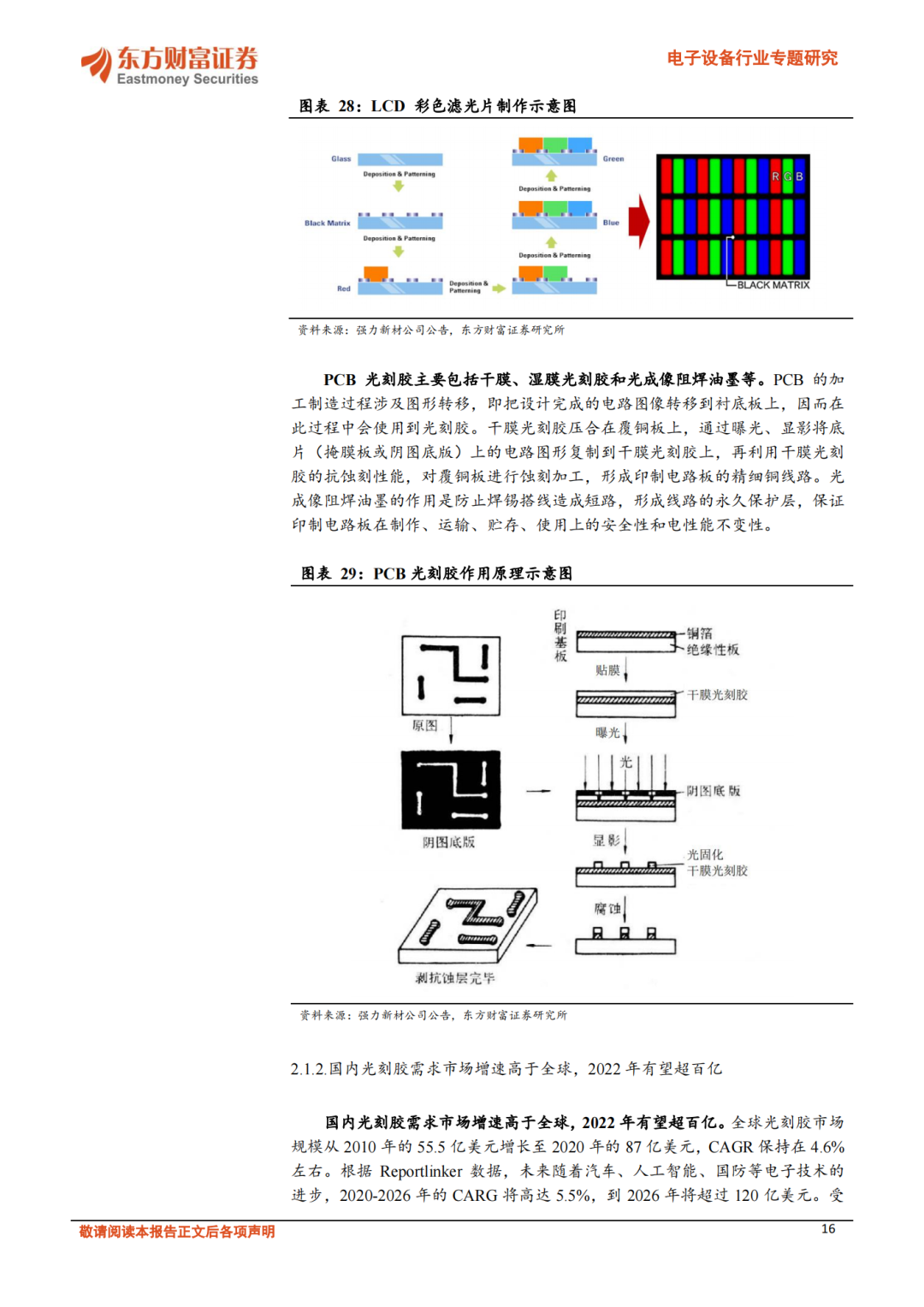 ◆ 光刻胶市场不断扩容,高端光刻胶亟需国产替代。随着下游半导体、LCD 和 PCB 三大领域的高速发展,Reportlinker 数据预计光刻胶市场亦将持续扩容,2022 年有望超百亿。我国光刻胶产品以中低端为主,技术难度较高的半导体领域的 KrF、ArF 光刻胶则几乎全部依赖进口,被日美垄断,亟需国产替代。
