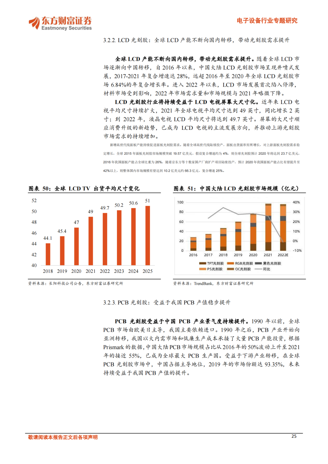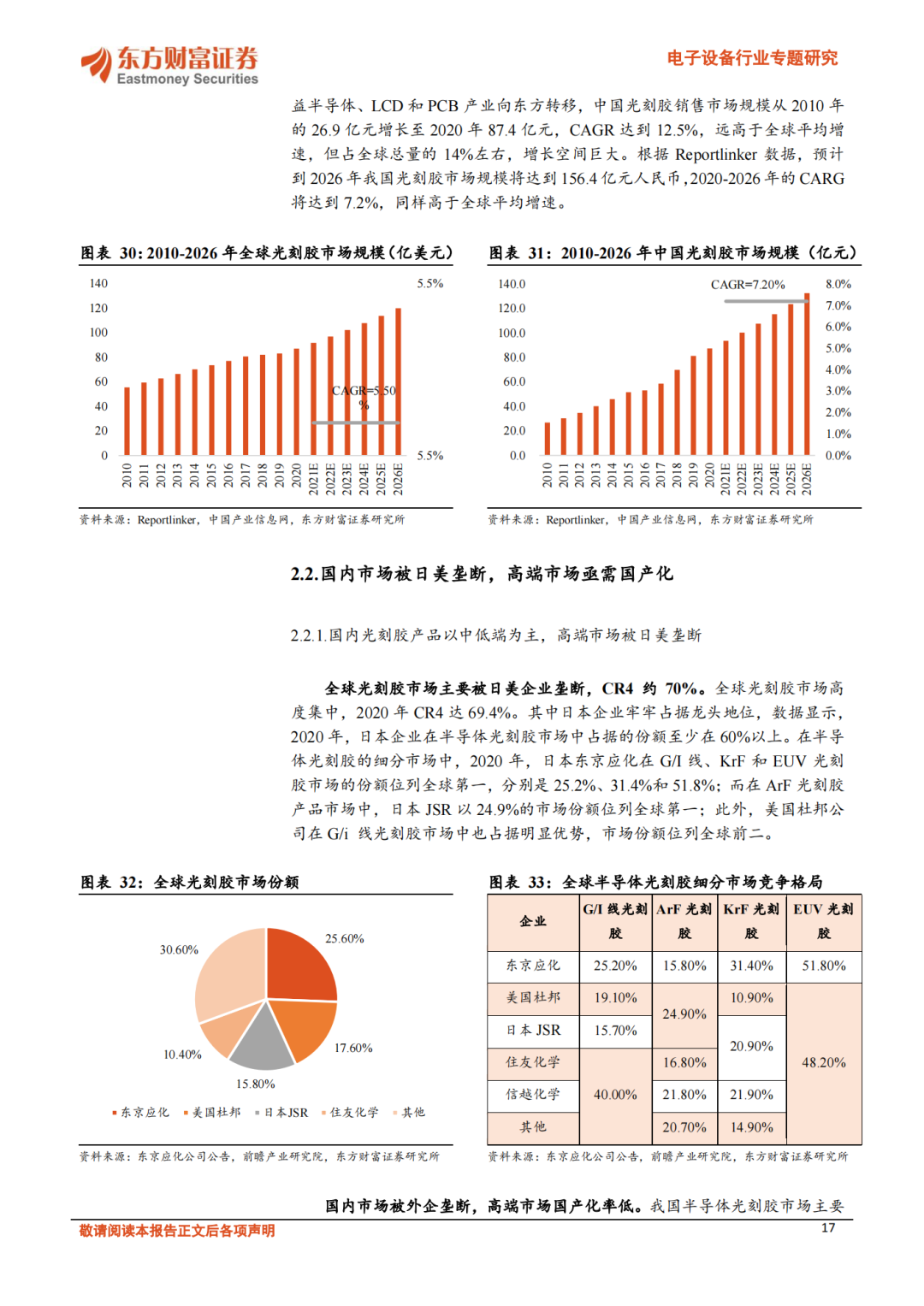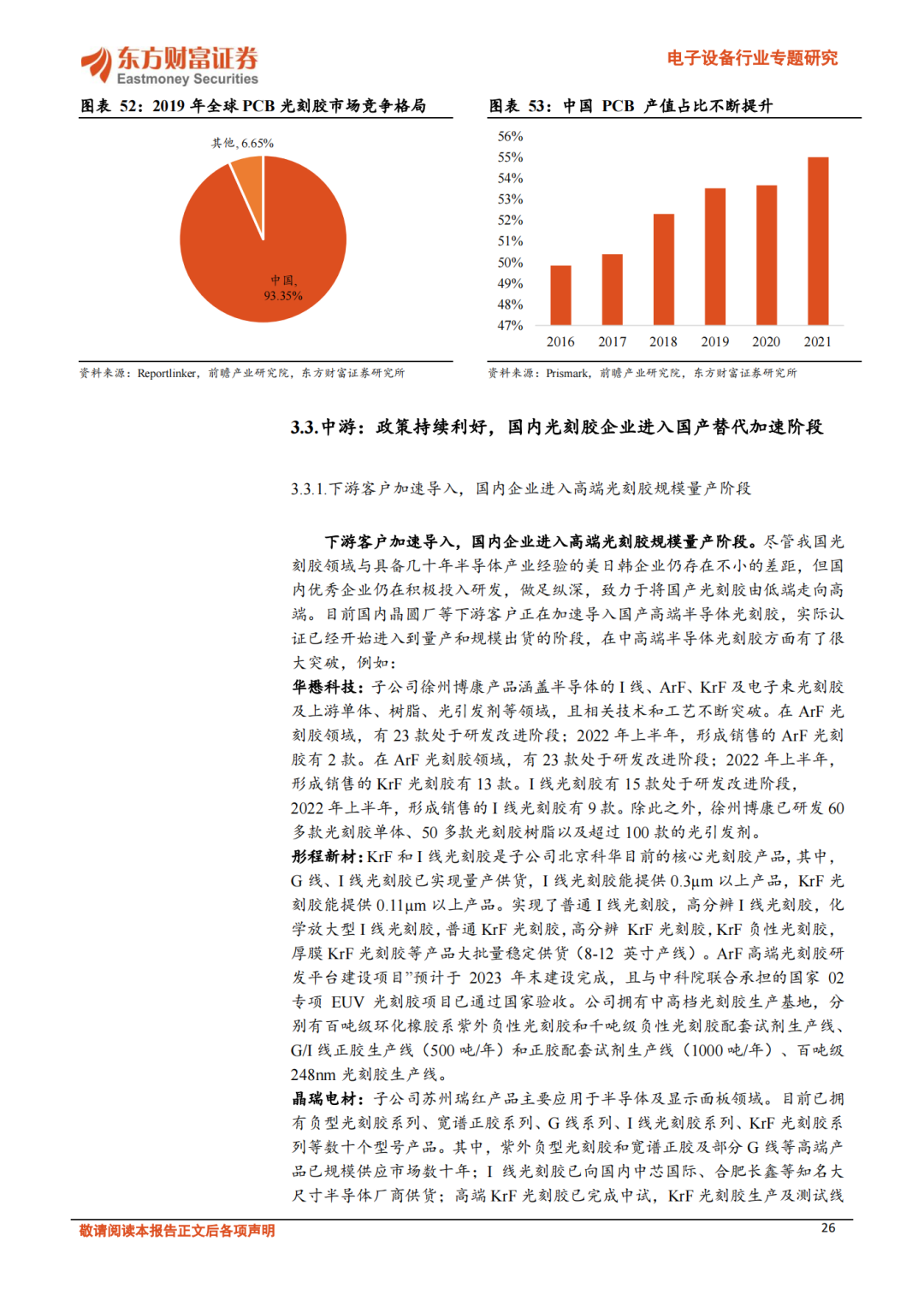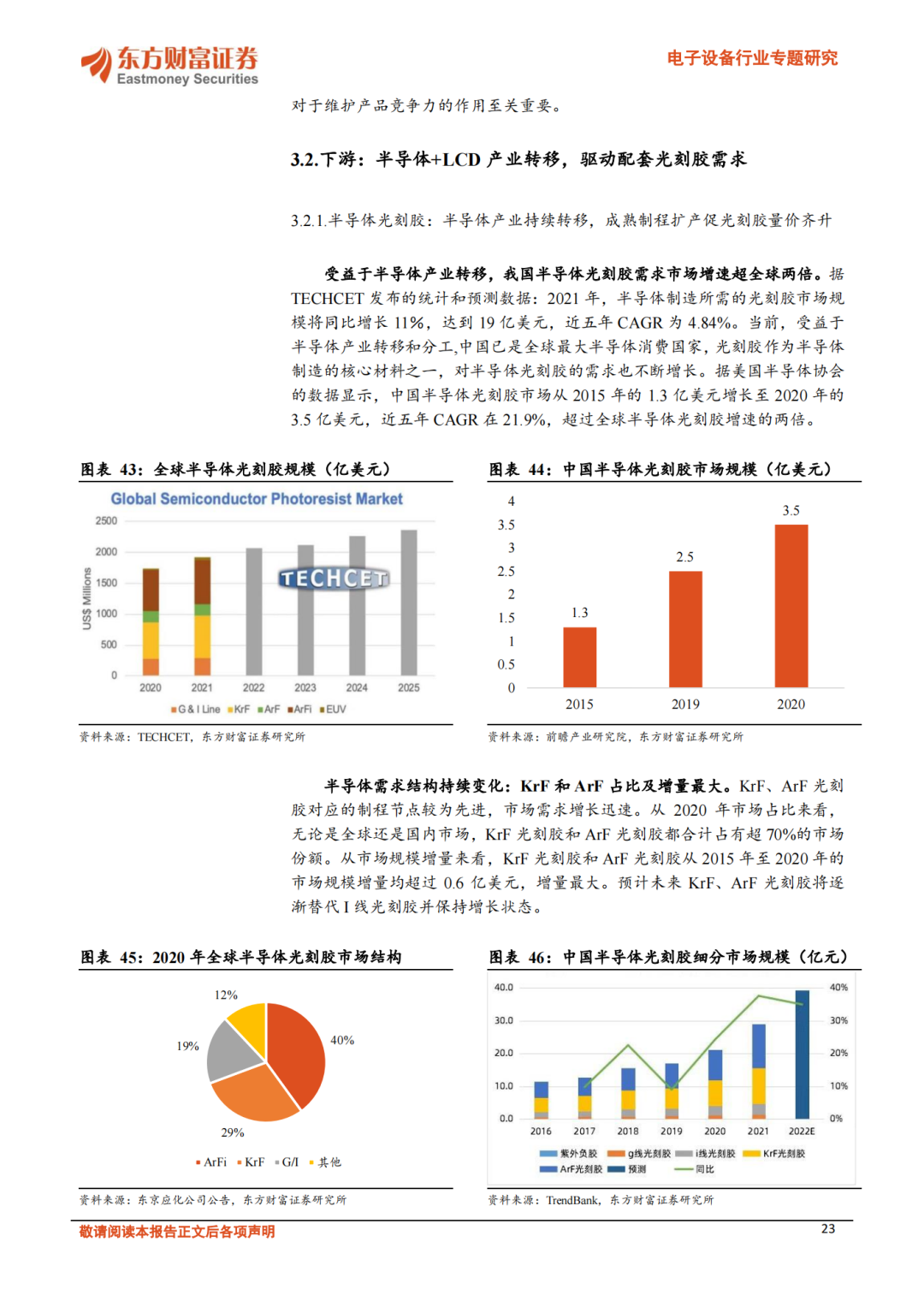 ◆ 光刻胶市场不断扩容,高端光刻胶亟需国产替代。随着下游半导体、LCD 和 PCB 三大领域的高速发展,Reportlinker 数据预计光刻胶市场亦将持续扩容,2022 年有望超百亿。我国光刻胶产品以中低端为主,技术难度较高的半导体领域的 KrF、ArF 光刻胶则几乎全部依赖进口,被日美垄断,亟需国产替代。
