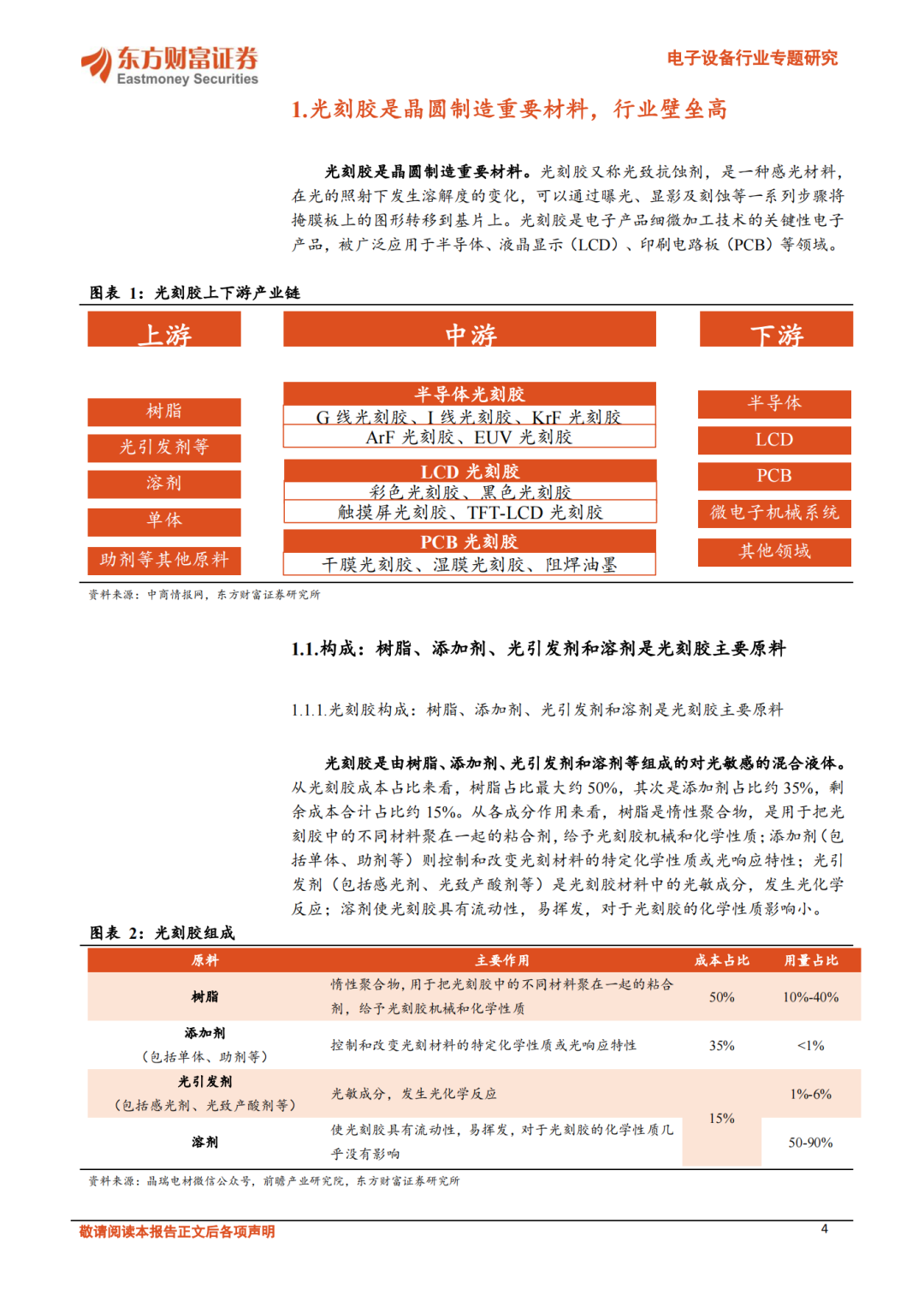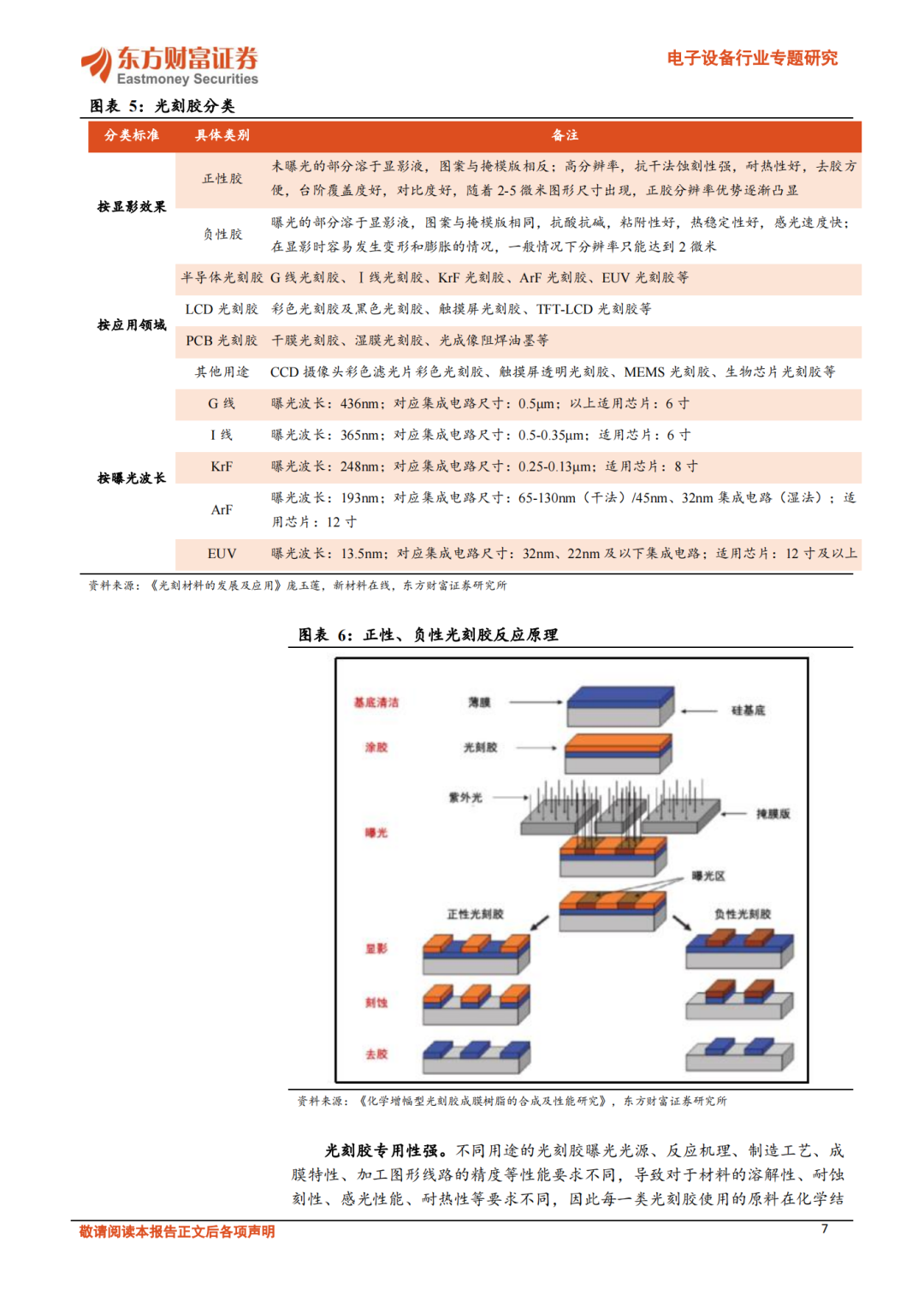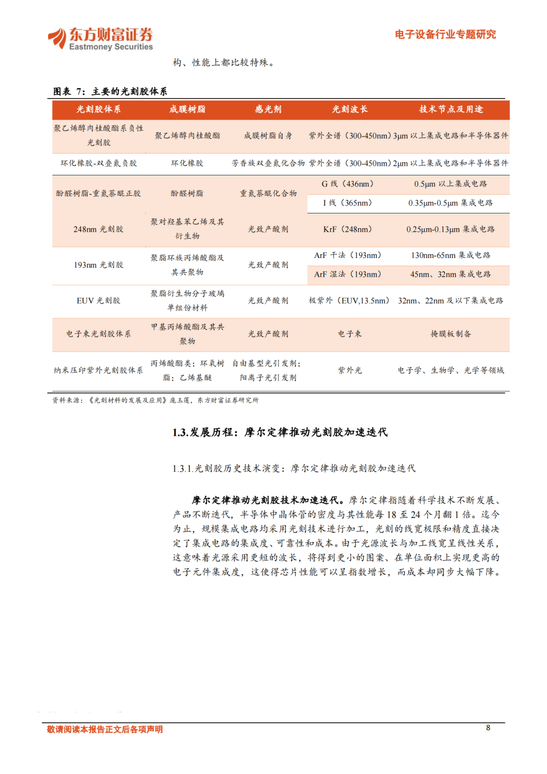 ◆ 光刻胶是晶圆制造重要材料,行业壁垒高。光刻胶是晶圆制造重要材料,承担“图形转移”重任。光刻胶种类繁多,专用性强。光刻的线宽极限和精度决定了集成电路的集成度、可靠性和成本,因此摩尔定律推动光刻胶技术不断加速迭代。同时光刻胶行业具备技术、客户、设备及原料四大高壁垒。