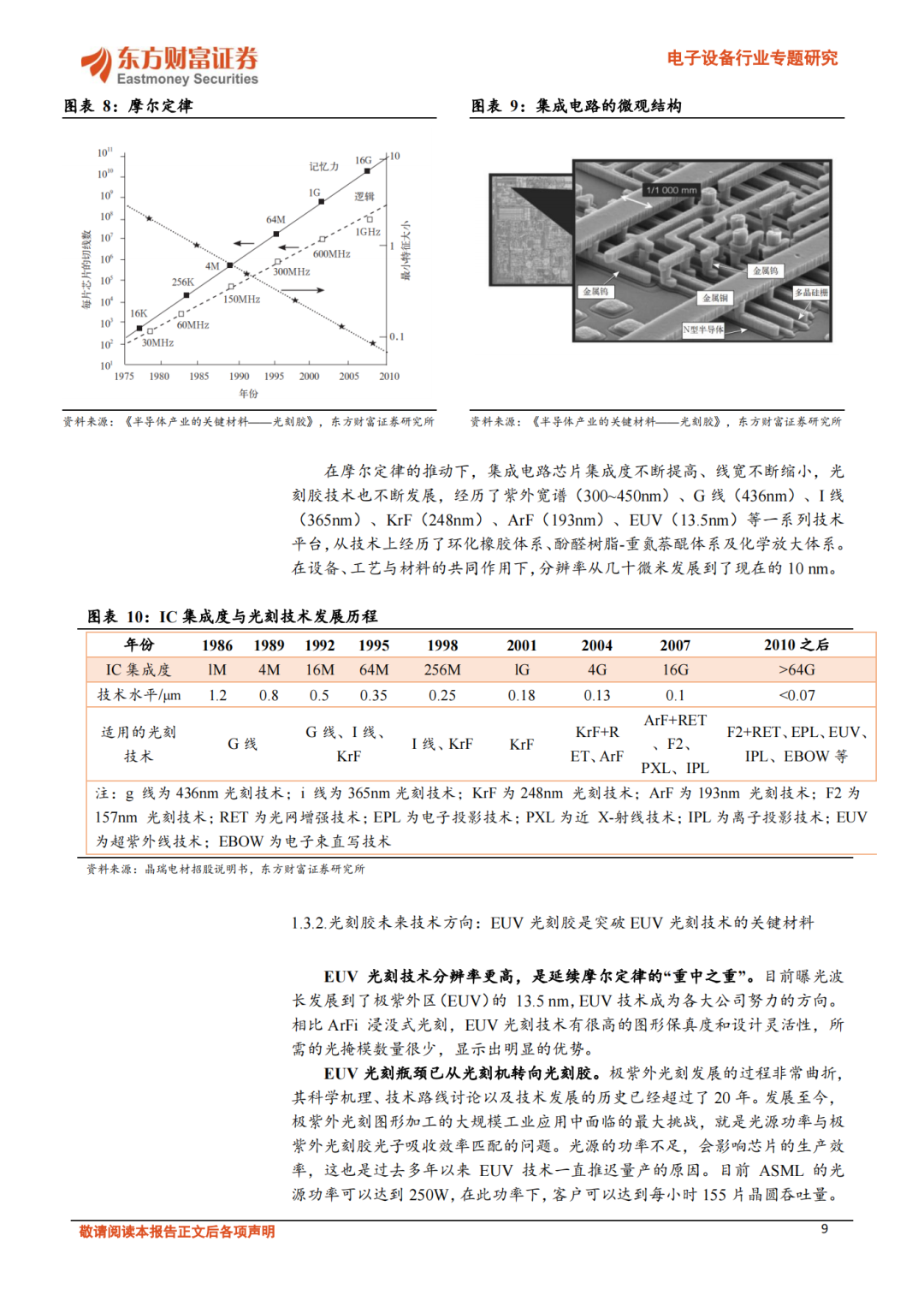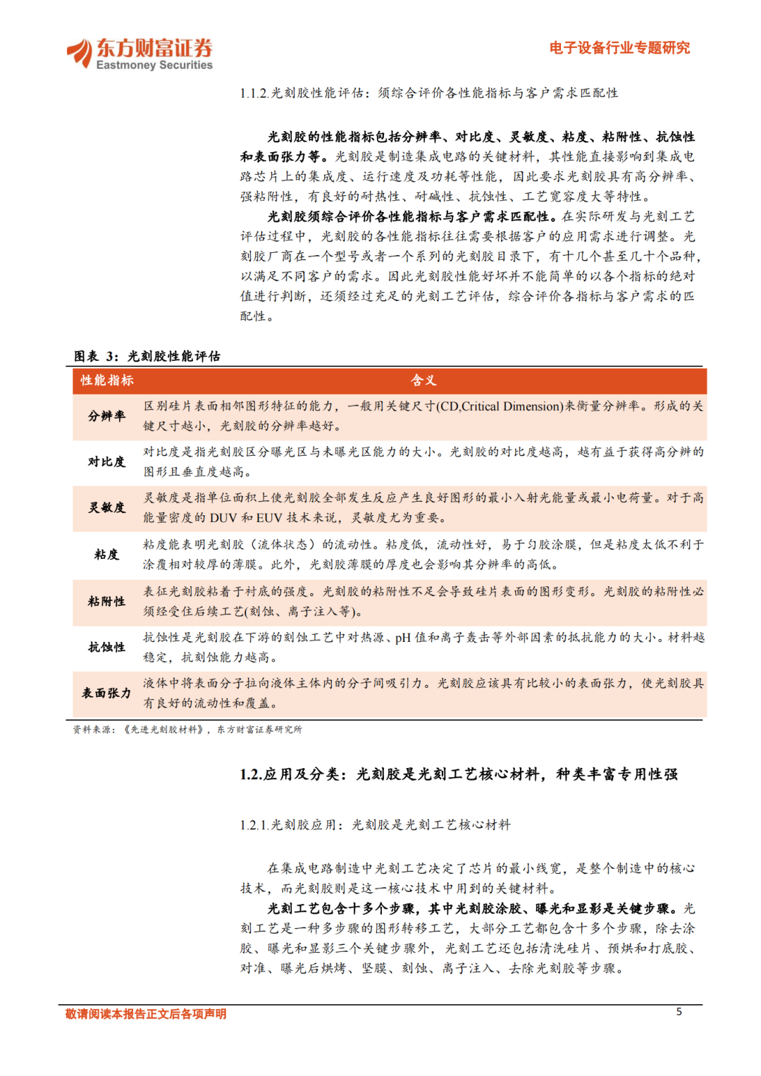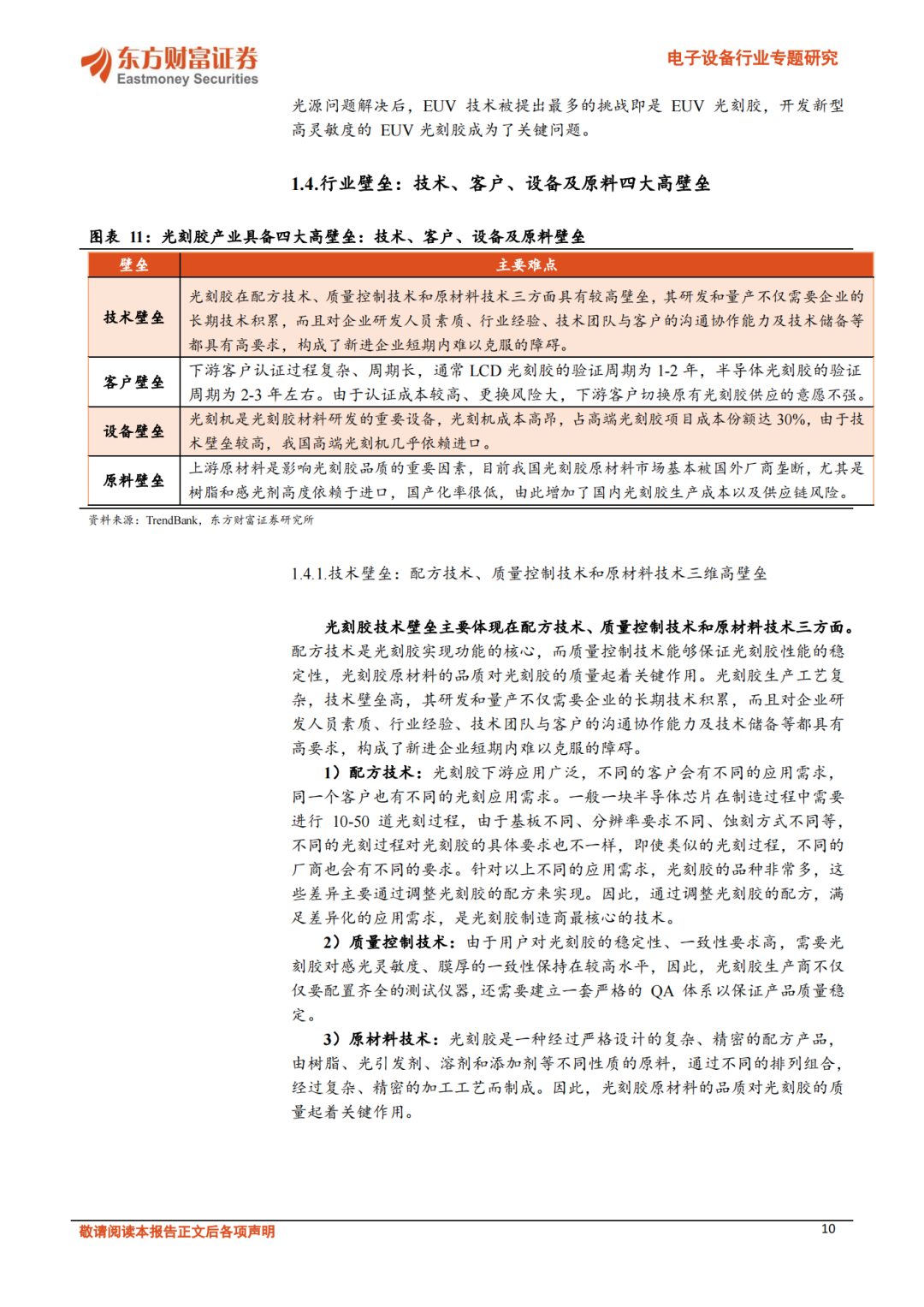 ◆ 光刻胶是晶圆制造重要材料,行业壁垒高。光刻胶是晶圆制造重要材料,承担“图形转移”重任。光刻胶种类繁多,专用性强。光刻的线宽极限和精度决定了集成电路的集成度、可靠性和成本,因此摩尔定律推动光刻胶技术不断加速迭代。同时光刻胶行业具备技术、客户、设备及原料四大高壁垒。