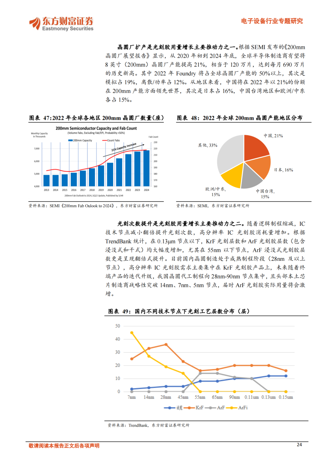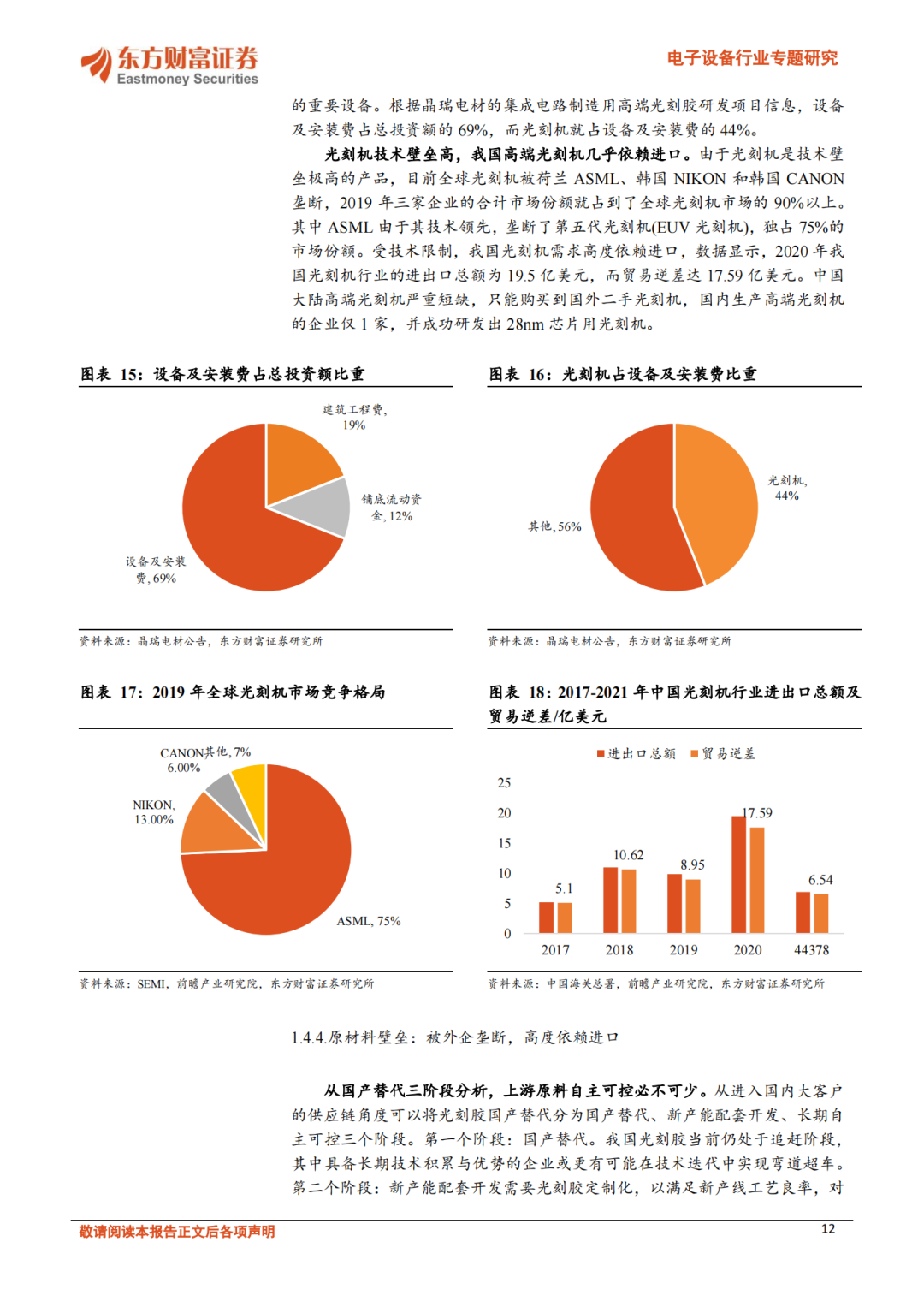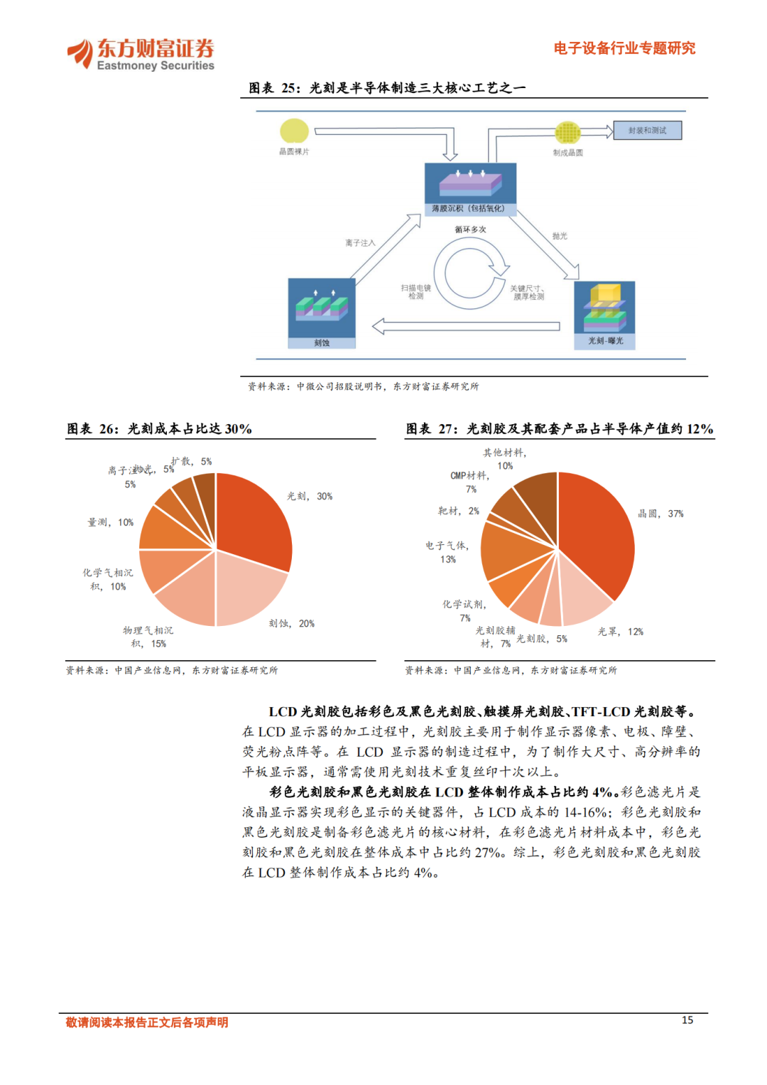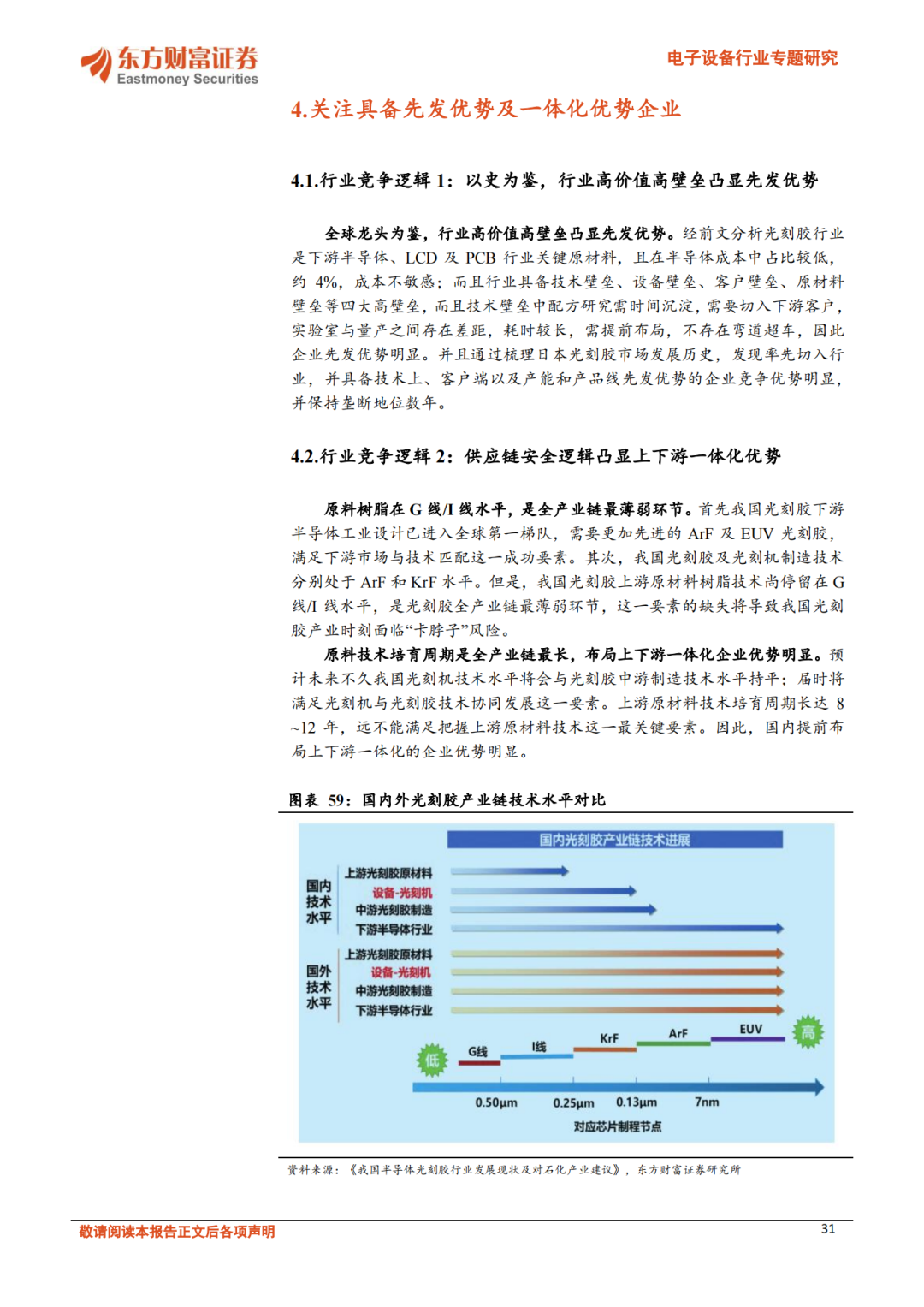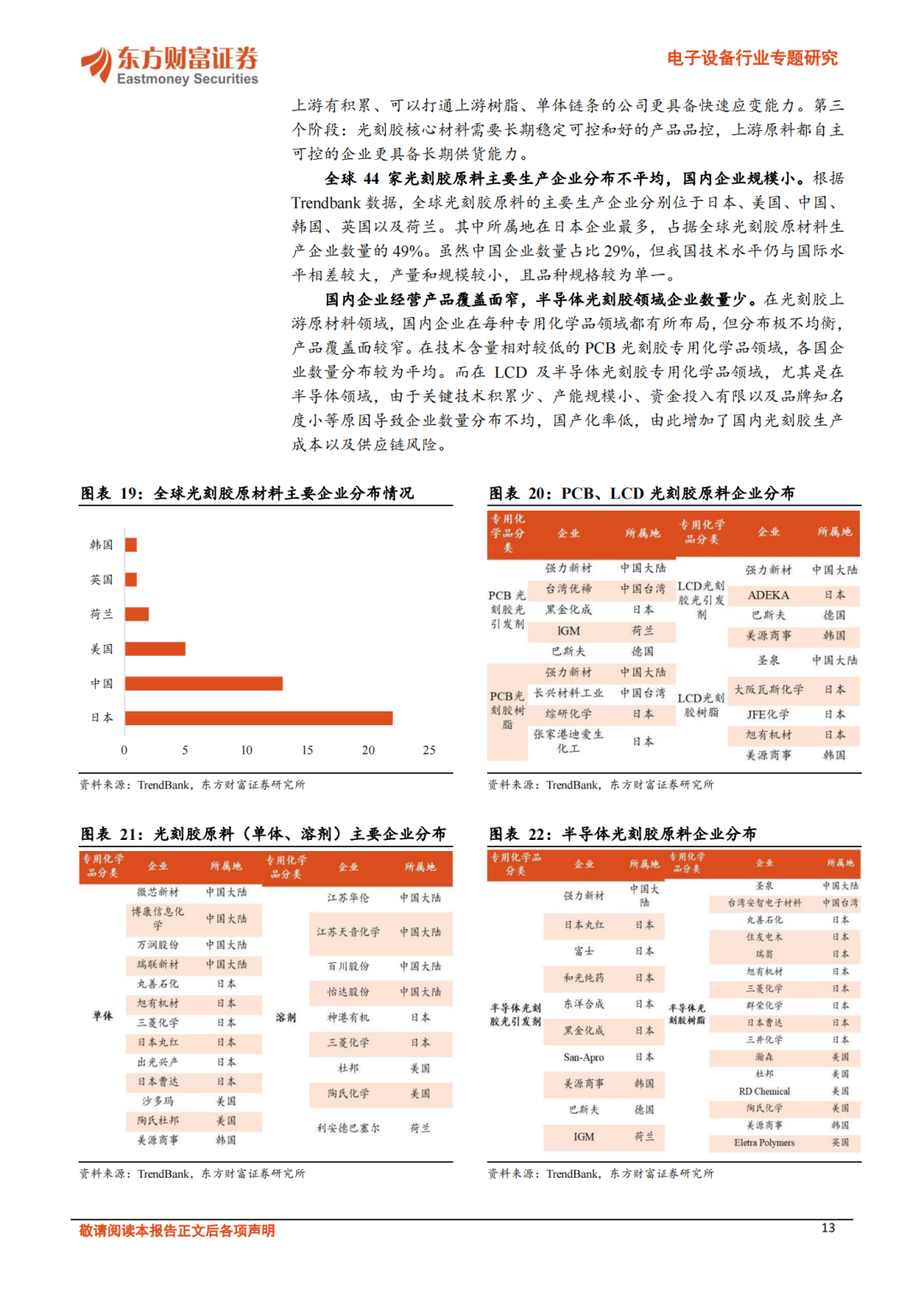 ◆ 以史为鉴产业链协同是关键,全产业链自主可控进步加速国产化。复盘日本光刻胶产业崛起关键因素为上下游协同发展,对比我国光刻胶产业全产业链自主可控不断突破:1)下游伴随半导体和 LCD 产业不断向国内转移,驱动配套光刻胶需求提升。2)中游政策不断利好,国内企业进入高端光刻胶量产和规模出货阶段,国产化加速。3)上游原料和设备虽然被外企垄断,但国内部分企业积极投入研发,已有所突破,全产业链自主可控进步将加速光刻胶国产替代。